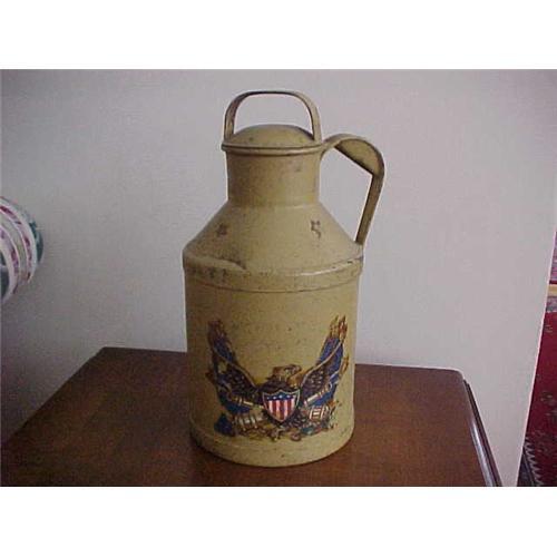 Cream can painted yellow; 13" tall; With American Eagle shield and cannons.