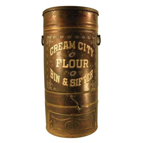 Cream City Flour Store Bin and Sifter. Very good original condition. 27 1/3 inches tall X 13 inch diameter.