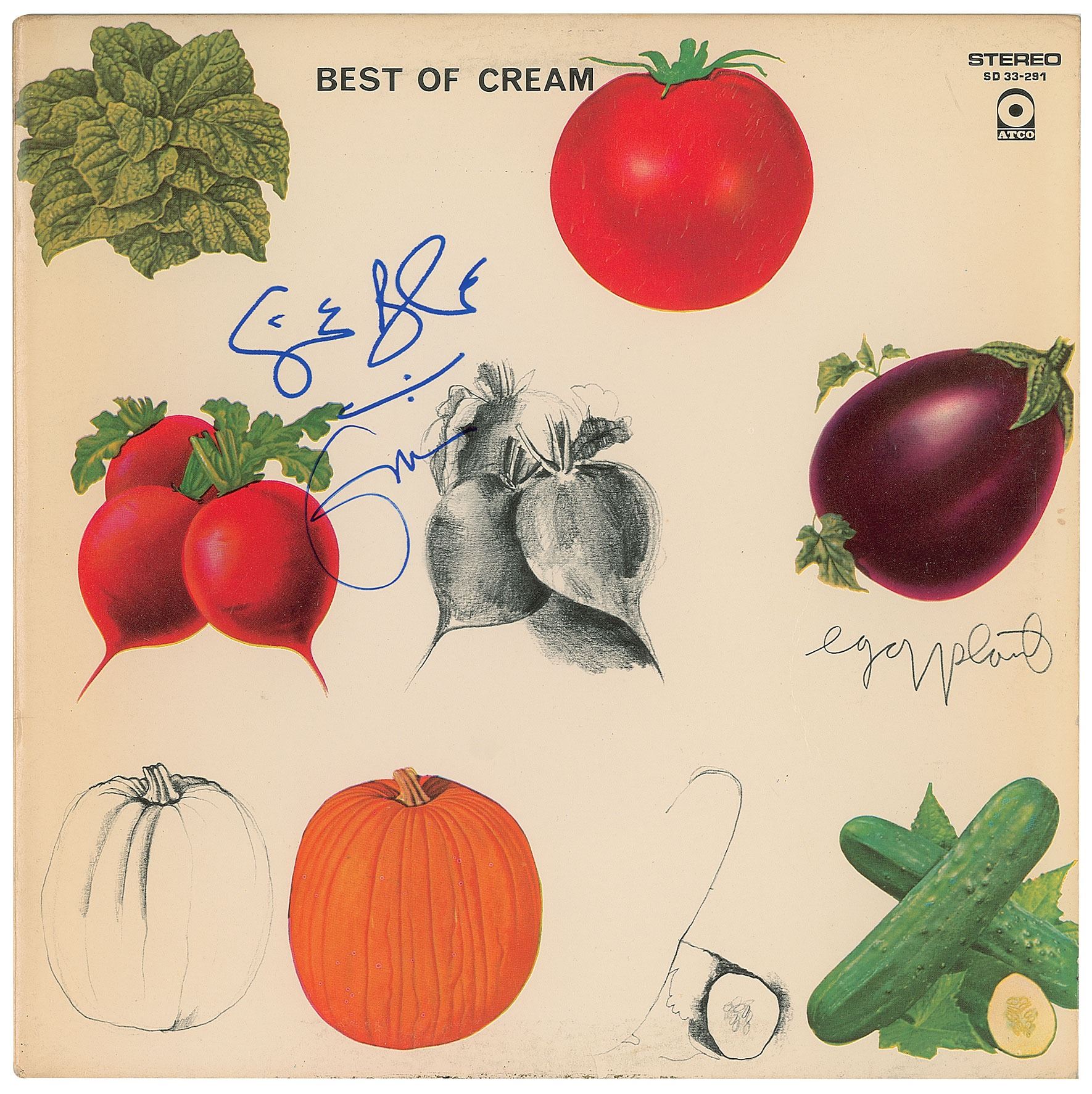 Best of Cream album signed on the front cover in blue felt tip by Eric Clapton and Ginger Baker. In fine condition. The record is not included.