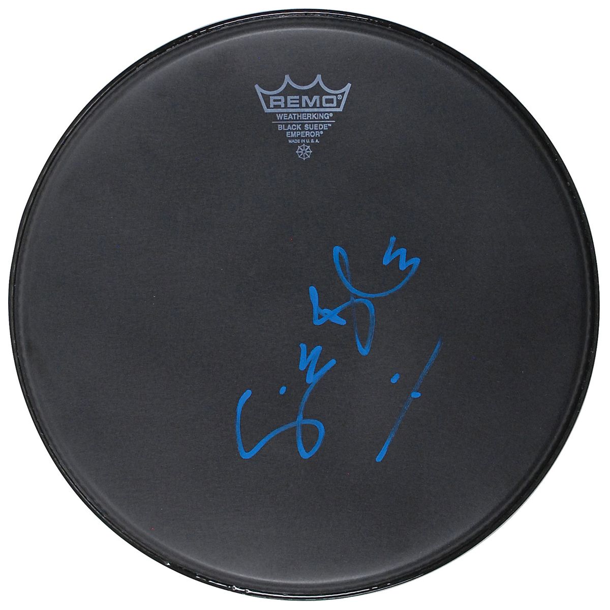 Unused black 12? Remo coated drumhead, signed in blue ink by Baker. In very fine condition.
