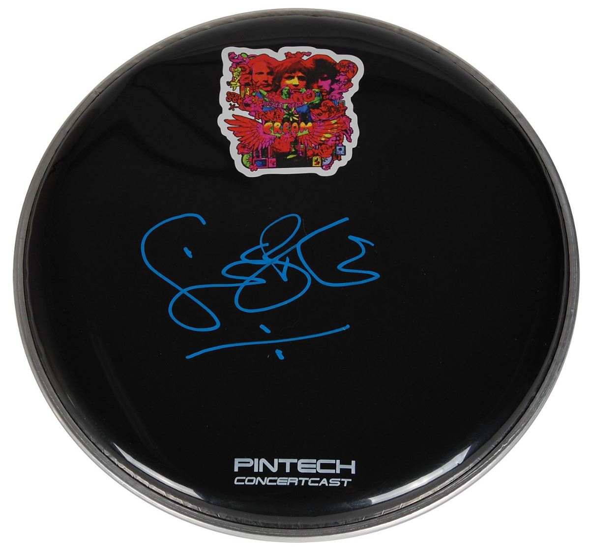 Black coated 10.5? Pintech Concertcast drumhead bearing an affixed Cream sticker, signed in blue ink by Ginger Baker. In fine condition.