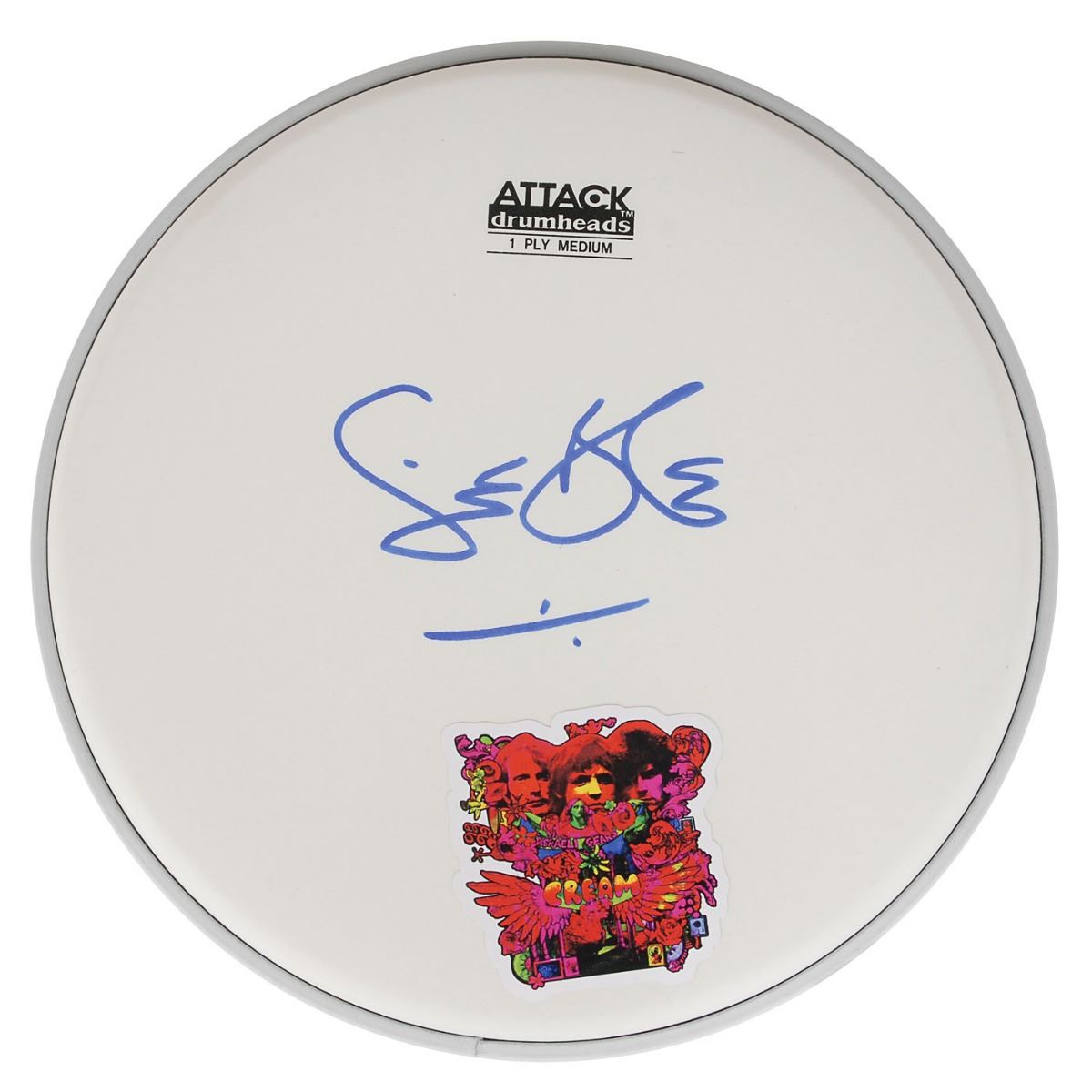 Off-white coated Attack drum head, 10.5? in diameter, signed in blue felt tip by Ginger Baker. Lower portion bears an affixed Cream sticker. In fine condition.