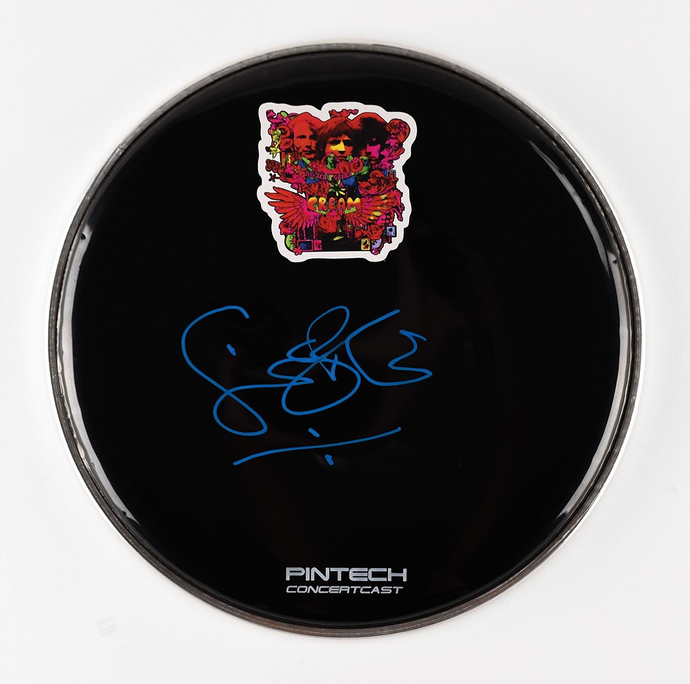 Black Pintech Concertcast drum head, 10.5? in diameter, signed in blue paint pen by Ginger Baker, with upper portion bearing an affixed Cream 'Disraeli Gears' sticker. In fine condition.