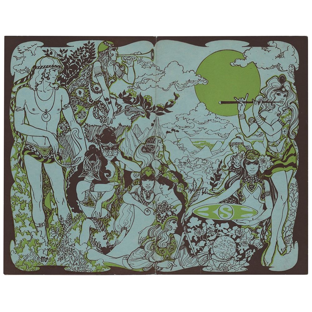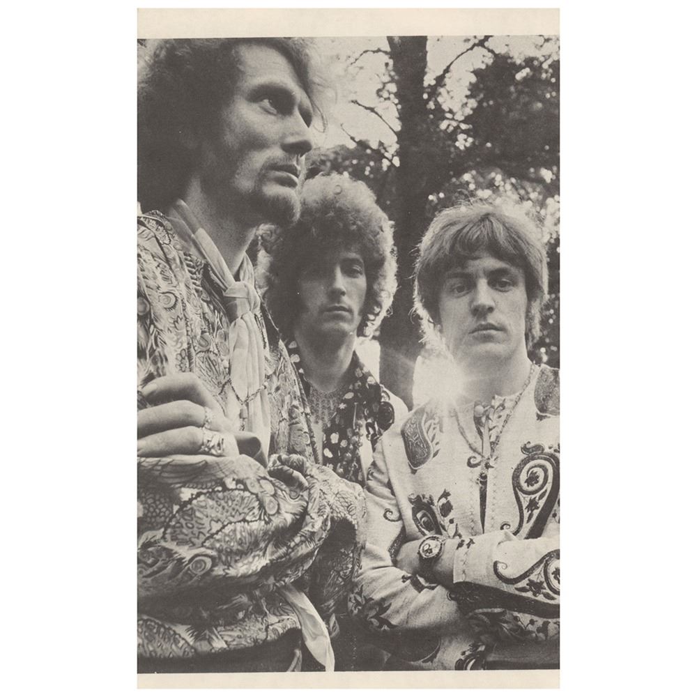 Unique psychedelic original program for a Cream concert at London's Saville Theatre on July 2, 1967, four pages, 6 x 9.5, featuring colorful cover artwork by Simon and Marajke, who were part of The Fool, the Dutch artists collective responsible for the artwork for the Beatles' Sgt. Pepper’s Lonely Hearts Club Band inner sleeve, the mural painted on the Beatles' Apple Boutique on Baker Street, and the infamous hand-painted Eric Clapton Gibson SG known as 'The Fool' guitar, to name a few of their many psychedelic art projects during the 60’s. The program features images and information on the evening's three scheduled performers and compere, including: Cream, the Jeff Beck Group featuring a young singer by the name of Rod Stewart and bassist Ronnie Wood, John Mayall's Bluesbreakers featuring future Rolling Stone Mick Taylor, and Rick Dane. In fine condition, with light handling wear. The Saville Theatre had a short, but historic run of concerts produced by Beatles manager Brian Epstein.