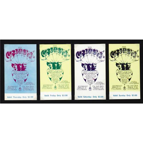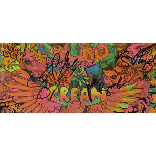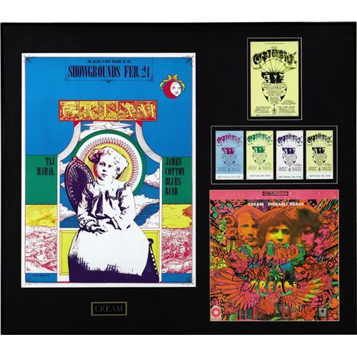 <B>Cream Showgrounds Concert Poster with Fillmore Postcard, Ticket Set, and Signed Album (1968)</B></I> Blues-based supergroup the Cream was formed by a trio of Great Britain's best: singer/bassist Jack Bruce, drummer Ginger Baker, and former Yardbirds and John Mayall guitarist Eric Clapton. From 1966 until their final show at London's Royal Albert Hall in 1969, they reigned supreme as Rock's "heaviest" players. Here's a collection of items from their heyday, including a Near Mint copy of the February 24, 1968 concert at Santa Barbara's Earl Warren Showgrounds, designed by Frank Bettencourt; a postcard and a set of four tickets to the band's March 7th Fillmore show and March 8-10 shows at the Winterland, presented by Bill Graham (BG110); plus a VG++ cover to the "Disraeli Gears" album, signed in black marker by all three members. Cream have reunited recently for a few (quickly) sold-out shows, but assembling all these scarce items, beautifully presented in a professionally framed and matted display measuring 33" x 29" will be tough to duplicate. Place that winning bid and you'll be "Sitting On Top of the World"!