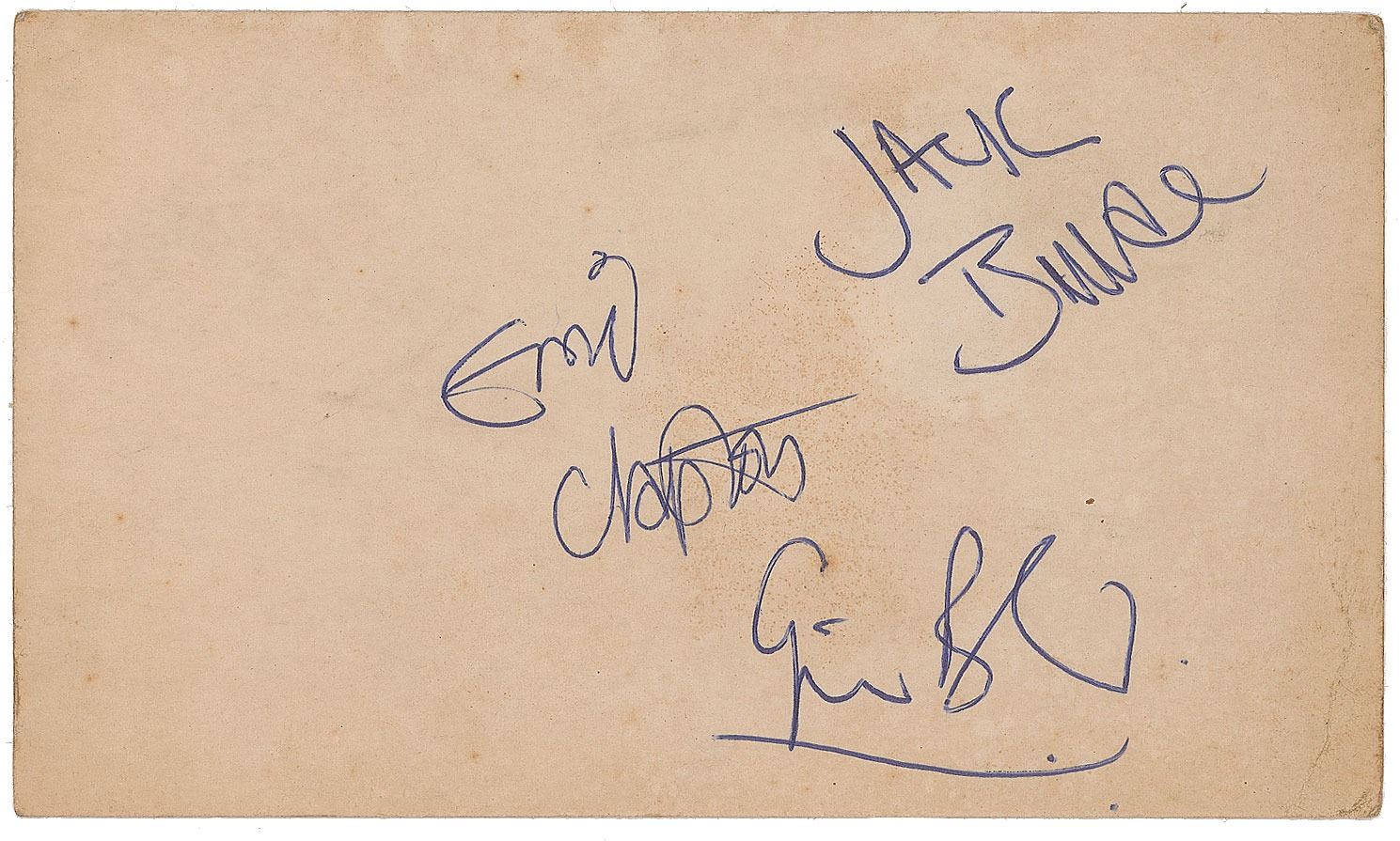Eric Clapton, Jack Bruce, and Ginger Baker were England’s premier musicians—this power trio defined the term ‘supergroup’ (which didn’t exist until they formed), and they were the cream of the crop, without peer. Their legendary improvised live performances were ferocious, melding jazz, blues, and rock into extended jams that left both band and their audiences spent by night’s end. They were three opposites who had one thing in common: they were virtuosos and knew how good they were and that it was too good to last. Accompanied by a provenance letter from the original recipient: "I worked at Stourbridge Town Hall from 1964 to 1967 helping out backstage and sometimes front of house. If the caretaker was not back from his meal break, I would let the groups into the building and help them set up. Fred Bannister promotions booked the top groups of the day to appear on Wednesday nights, with smaller local groups playing on Saturday nights. I met all the groups and obtained their autographs. When Cream played I got them to sign a couple pieces of card that I had cut at my place of work. One was for a friend, the other I kept. I remember that night as being a sell out with 100's of Mods in long jackets giving the group a rousing reception." Full sets of Cream autographs from when they were at their peak in the 60s are extraordinarily difficult to come by and this offering represents the boldest set of Cream signatures that we have ever offered.