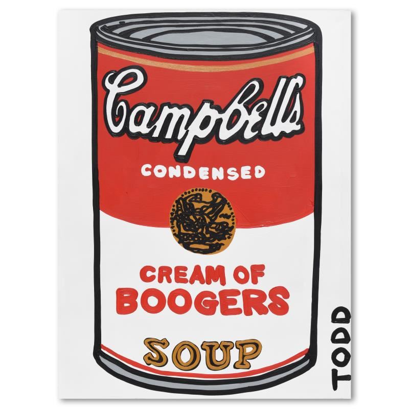 "Cream of Boogers Soup" is an original acrylic painting on gallery wrapped canvas by Todd Goldman, hand signed by the artist. Includes Letter of Authenticity. Measures approx. 36" x 48" (image). Due to the way this piece was stored there may be minor wear or signs of age (such as wear on the corners) but the piece is in overall good condition.