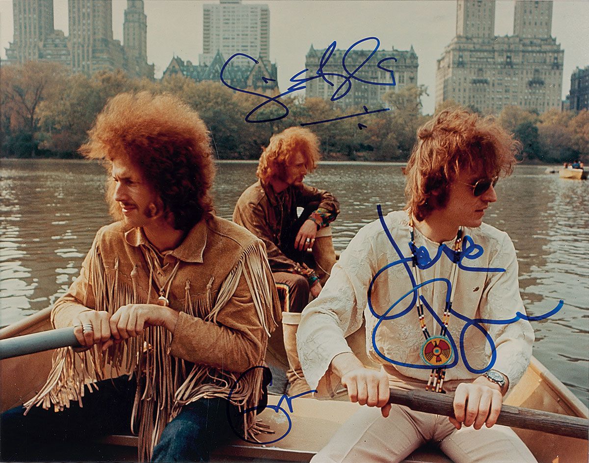 Choice color glossy 14 x 11 photo of Cream in a small boat, signed in-person in blue felt tip by Eric Clapton, Ginger Baker, and Jack Bruce. In very fine condition. Originally obtained by in-person specialist Mike Wehrmann.