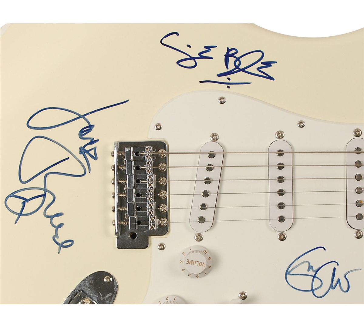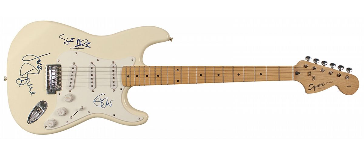 Cream-colored Fender Squier ‘stratocaster-style’ electric guitar, signed on the body in black felt tip by Jack Bruce and Ginger Baker and on the white pickguard in black felt tip by Eric Clapton. In fine condition.