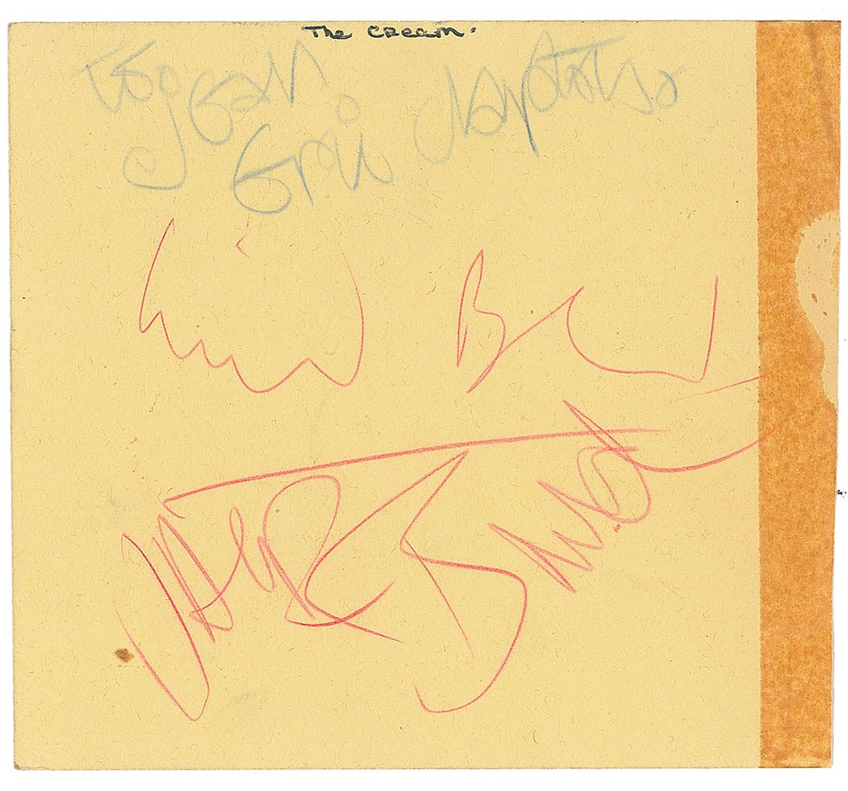 Vintage colored pencil signatures, “To Jean, Eric Clapton,” “Ginger Baker,” and “Jack Bruce,” on a yellow 4.25 x 4 album page, with a small collector’s notation along the top. In fine condition, with tape toning along right edge. Accompanied by a January 24, 1967, typed memo to Cream, informing the band of their upcoming appearance on Top of the Pops, advising them when to arrive at the studio, and giving the details of a dance they were to play the following night at the Adelphi Ballroom. A fantastic early set of signatures from rock’s first power trio.