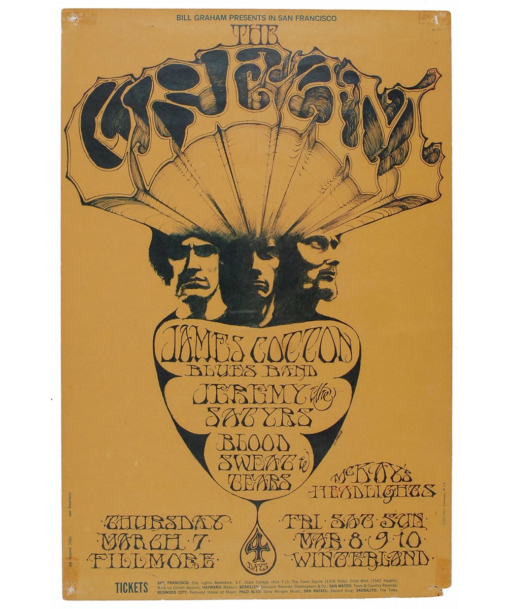 Original 13.75 x 21 concert poster for four Cream shows presented by Bill Graham at the Fillmore and Winterland, BG-110, in early March of 1968. Poster features detailed artwork by Stanley Mouse, with his depiction of the band in the center. In very good condition, with tack and staple holes to each corner, resulting in small areas of paper loss, some tape remnants to corners, some small edge tears, and a couple of scattered tack holes. These were the last of the historic Cream shows at the Fillmore.