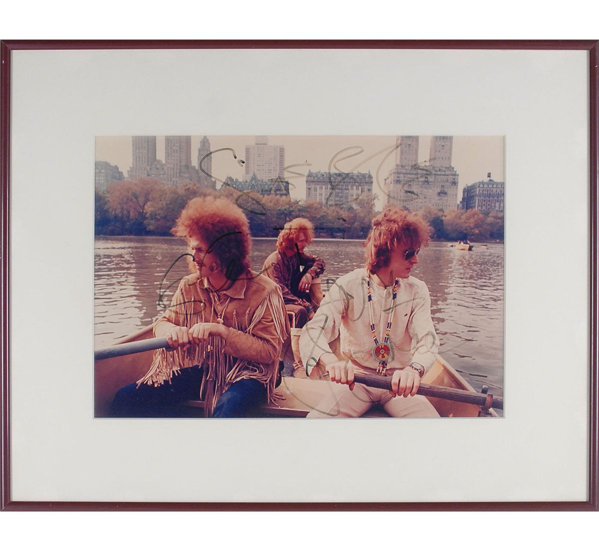 Color 13 x 9.25 photo of the band in a row boat, signed in black felt tip by Eric Clapton, Jack Bruce, and Ginger Baker. Matted and framed to an overall size of 19.25 x 15.25. All three signatures uniformly faded, but still legible, otherwise fine condition.