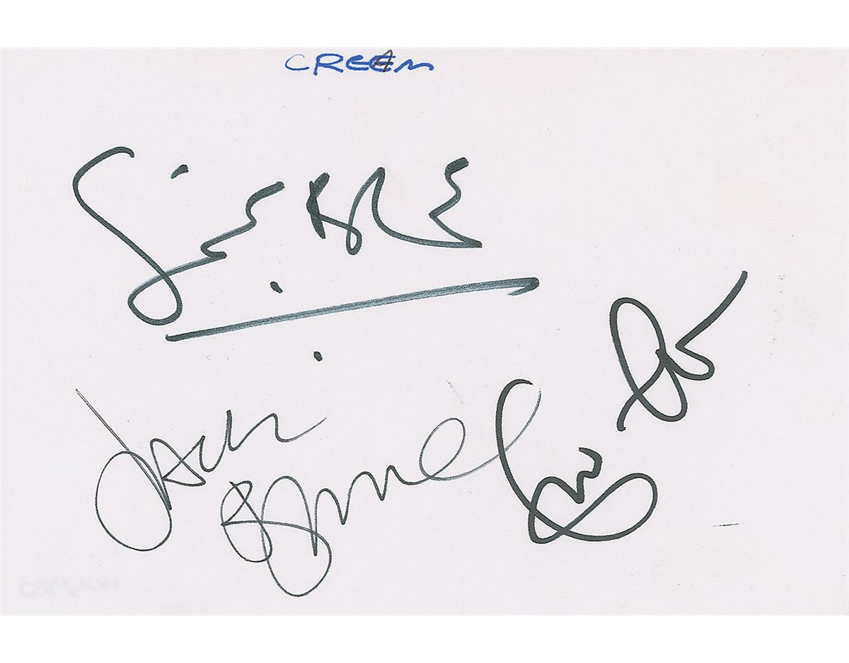 Crisp black felt tip signatures of Eric Clapton, Jack Bruce, and Ginger Baker on a white 6 x 4 card. Card bears a collector’s notation at the top. In fine condition.