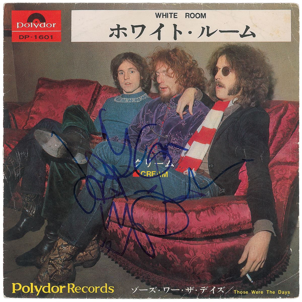 Polydor Records 45 rpm record sleeve for the Japanese single of ‘White Room / Those Were The Days,’ signed on the front in blue felt tip by Eric Clapton, Ginger Baker, and Jack Bruce. Creasing to edges and the signatures overlapping each other, otherwise fine condition. The record is not included.