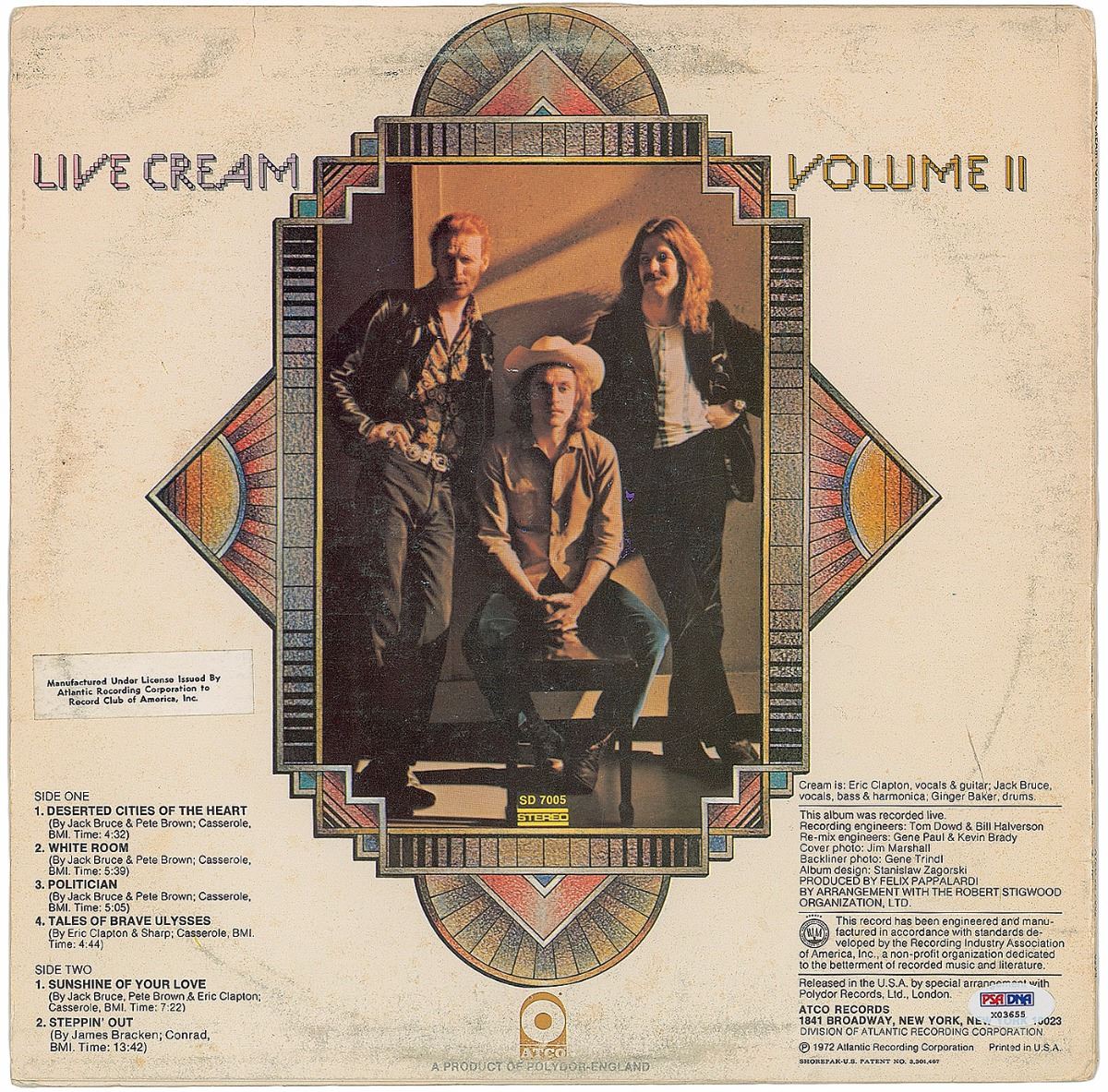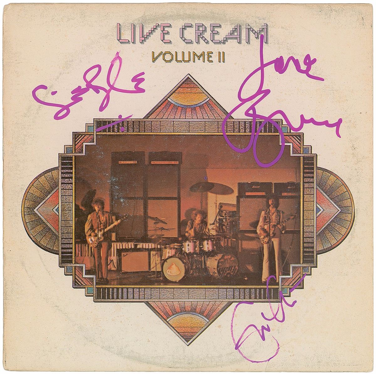 Volume II album signed on the front cover in pink paint pen by Eric Clapton, Ginger Baker, and Jack Bruce. In very good to fine condition. The record is not included. Accompanied by full letters of authenticity from REAL and PSA/DNA.