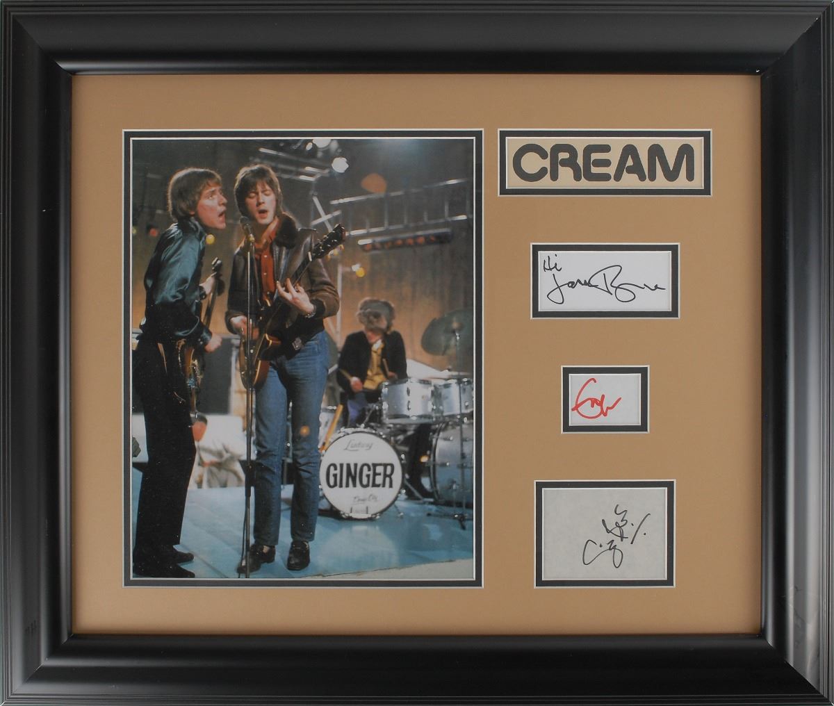 Display of three felt tip signatures, “Hi, Jack Bruce,” “Eric Clapton,” and “Ginger Baker,” on individual white and off-white slips, ranging in size from 4 x 1.75 to 2 x 1.5. Double-matted and framed with their logo and a large image of the band to an overall size of 26 x 22. In overall fine condition.