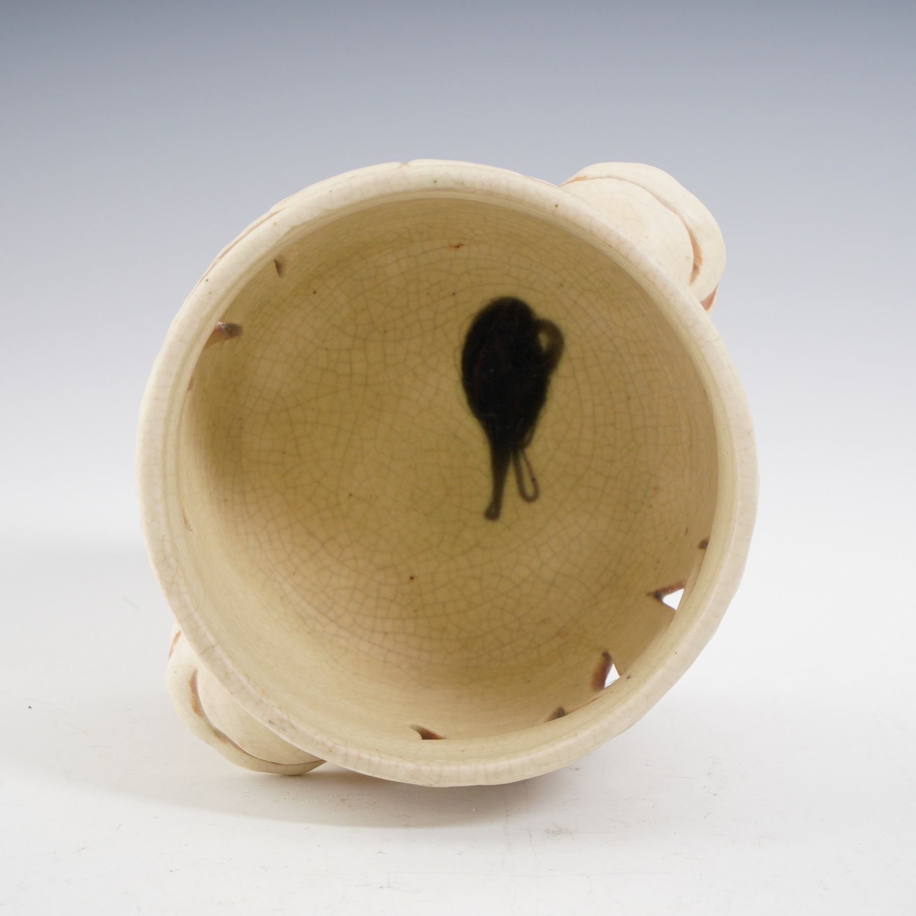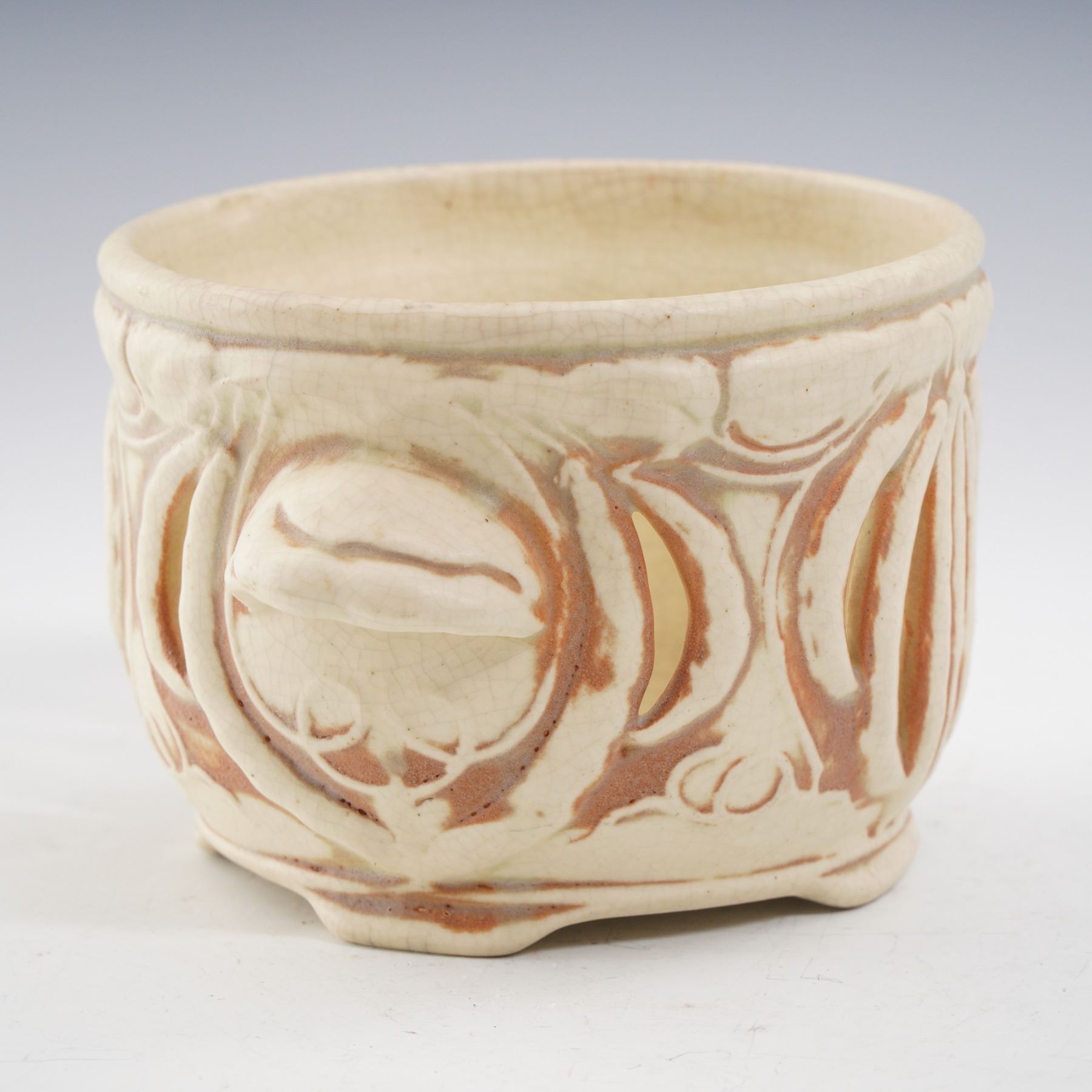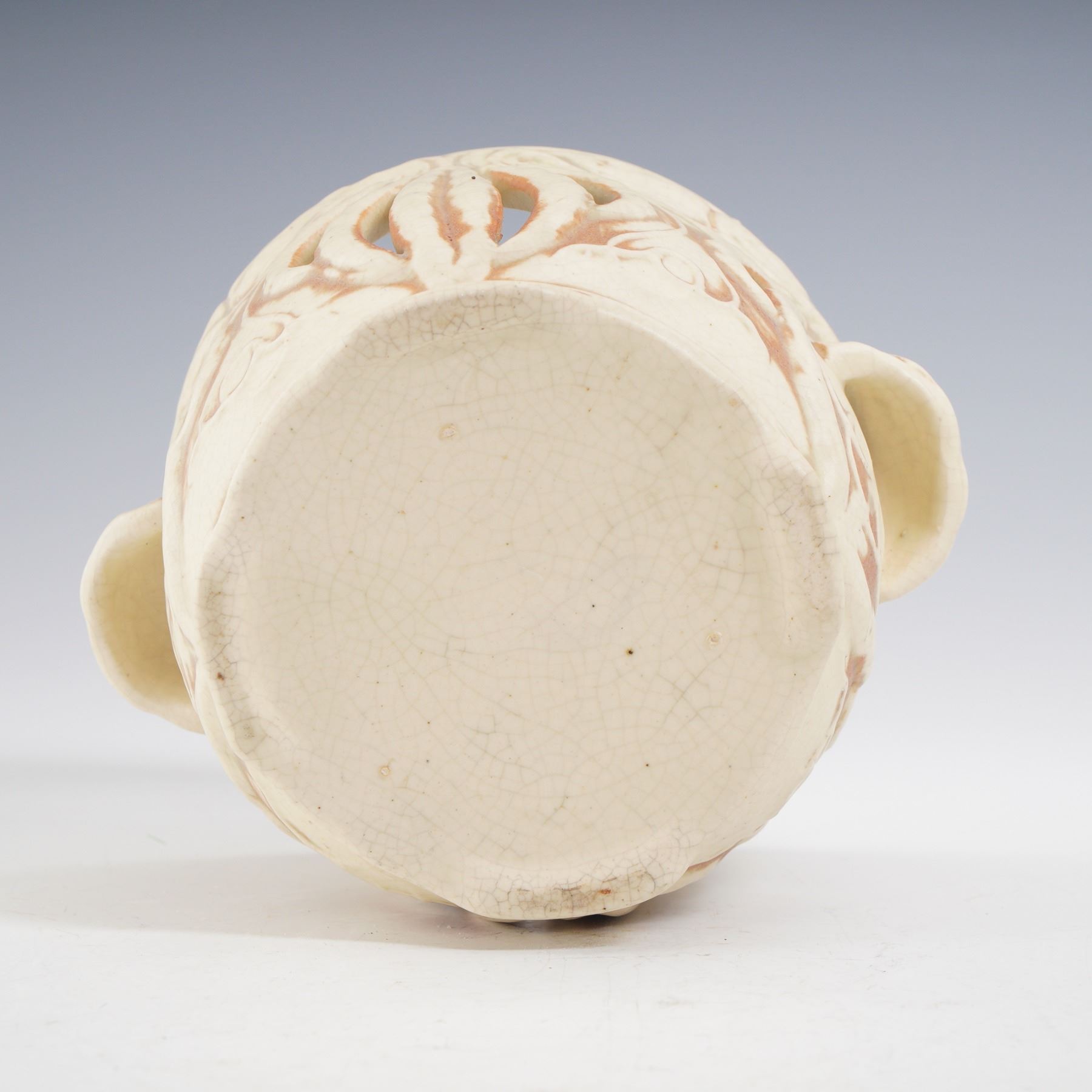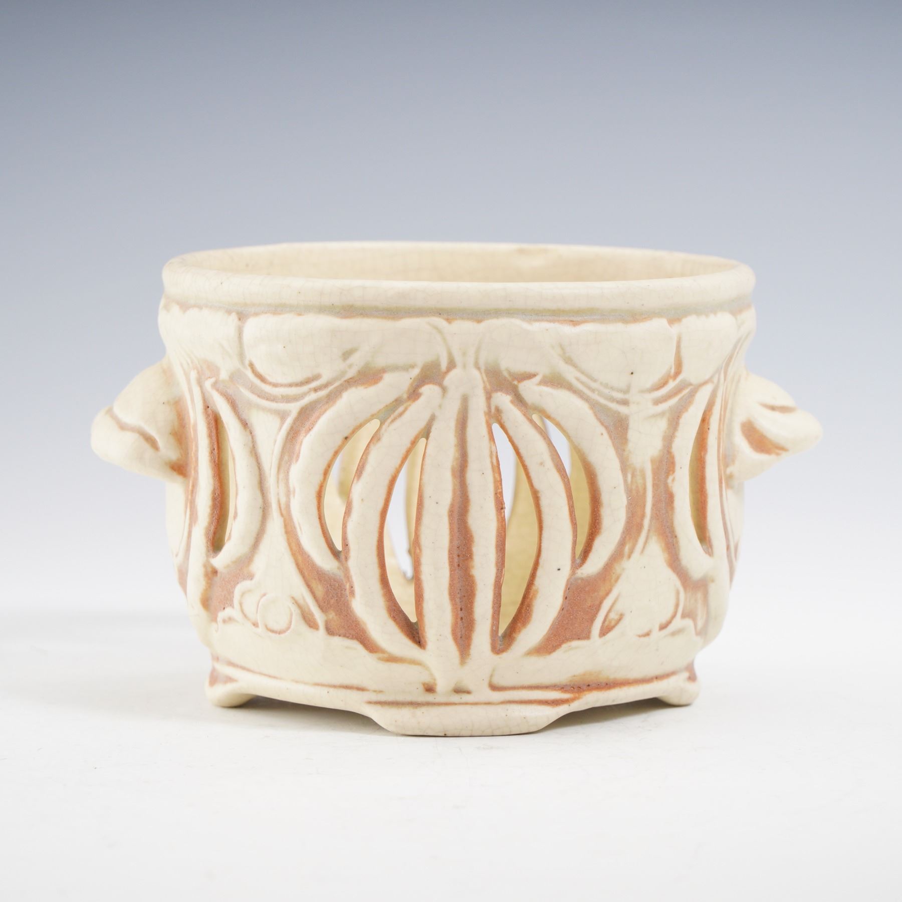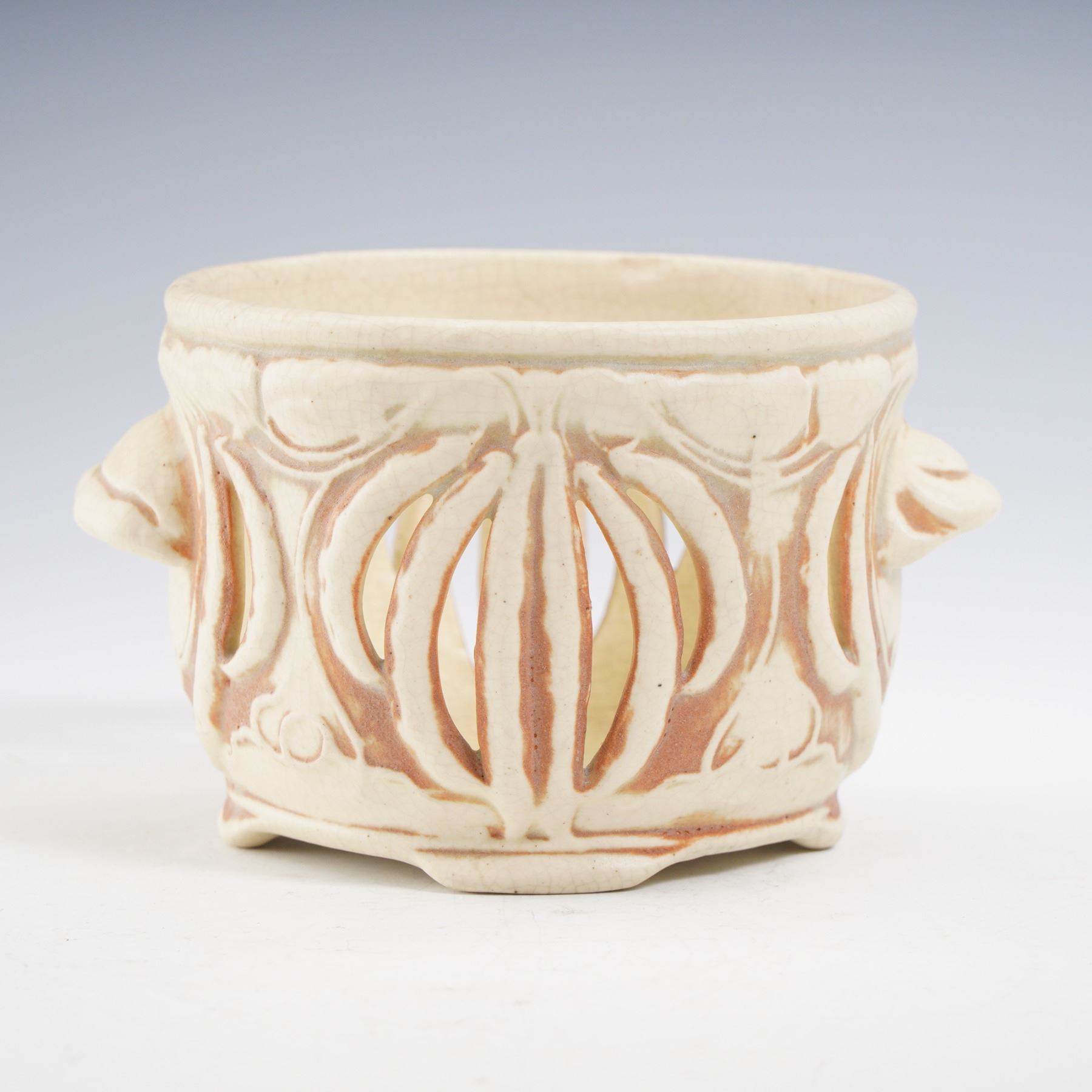 This finely crafted creamware pot showcases intricate reticulated cutwork in an elegant organic motif. The warm ivory glaze with soft reddish undertones accentuates the pierced design, giving it both decorative and functional appeal. Flanked by molded side handles and set on a raised foot, the vessel exudes the refined artistry of ceramics. The interior reveals natural kiln firing characteristics, adding to its authentic antique charm. An appealing piece that bridges decorative beauty and utilitarian form, perfect for collectors of early pottery and creamware.