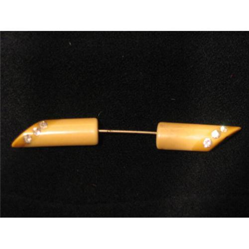An elegant little straight pin with end caps of creamy Bakelite half cylinders with angled ends and three diamond rhinestone accents. Length: 4 in, Width: 1/2 in, Thickness: 1/2 in.