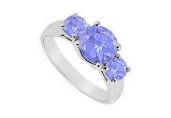 A bigger round created tanzanite is accented by two smaller created tanzanites on the sides. Made in .925 sterling silver rhodium this three stone ring has a total weight (TGW) of 3.00 carats.