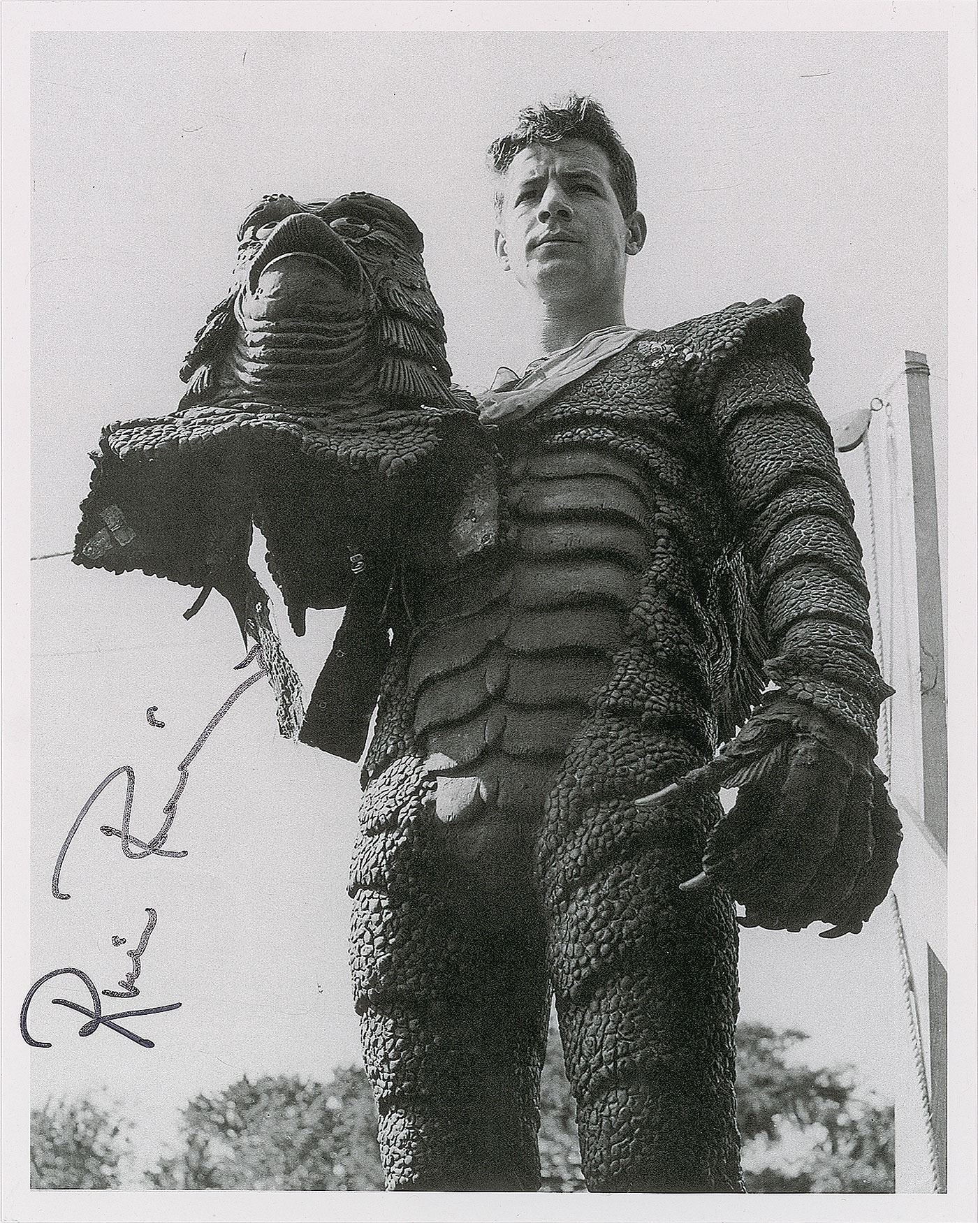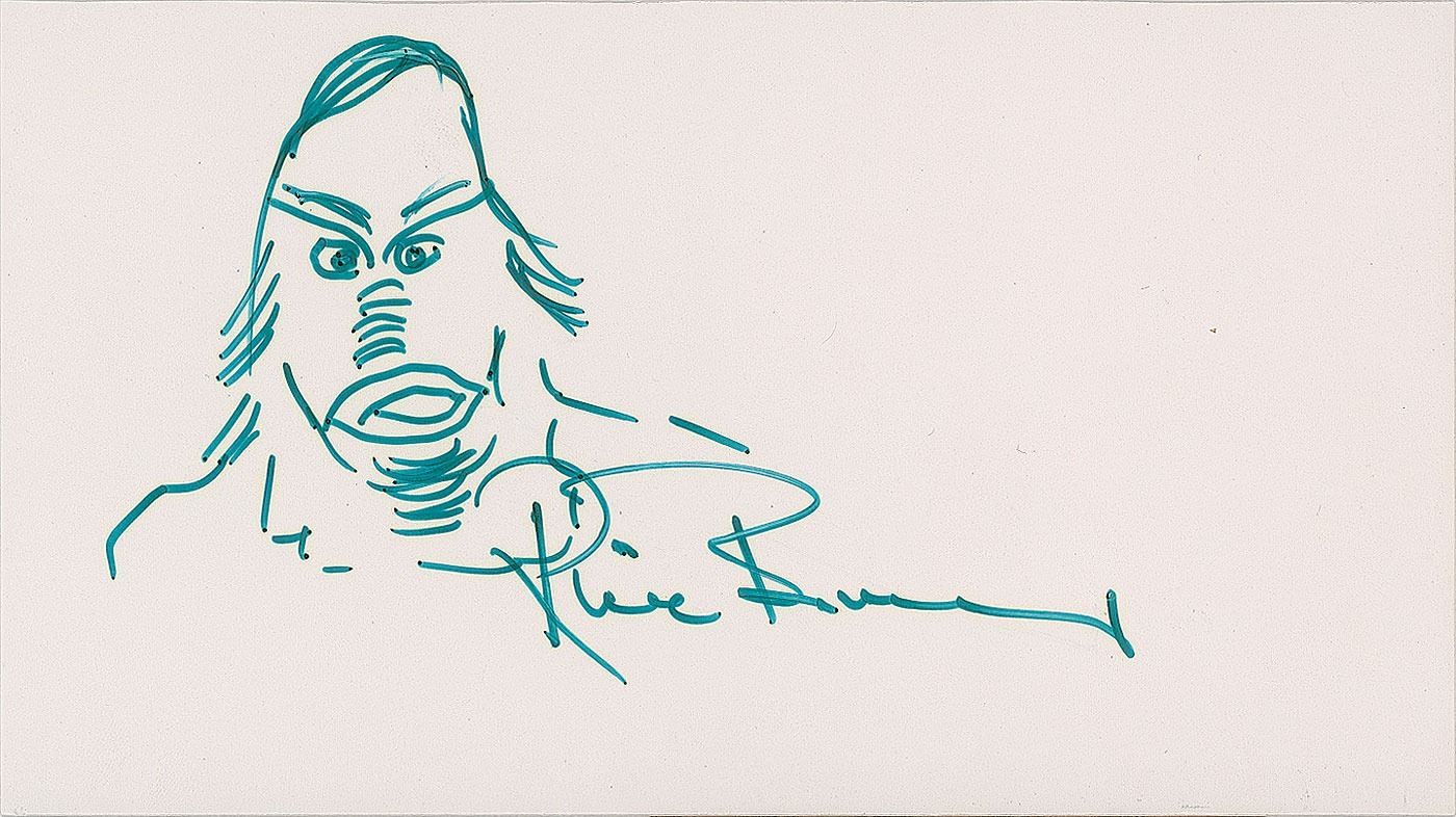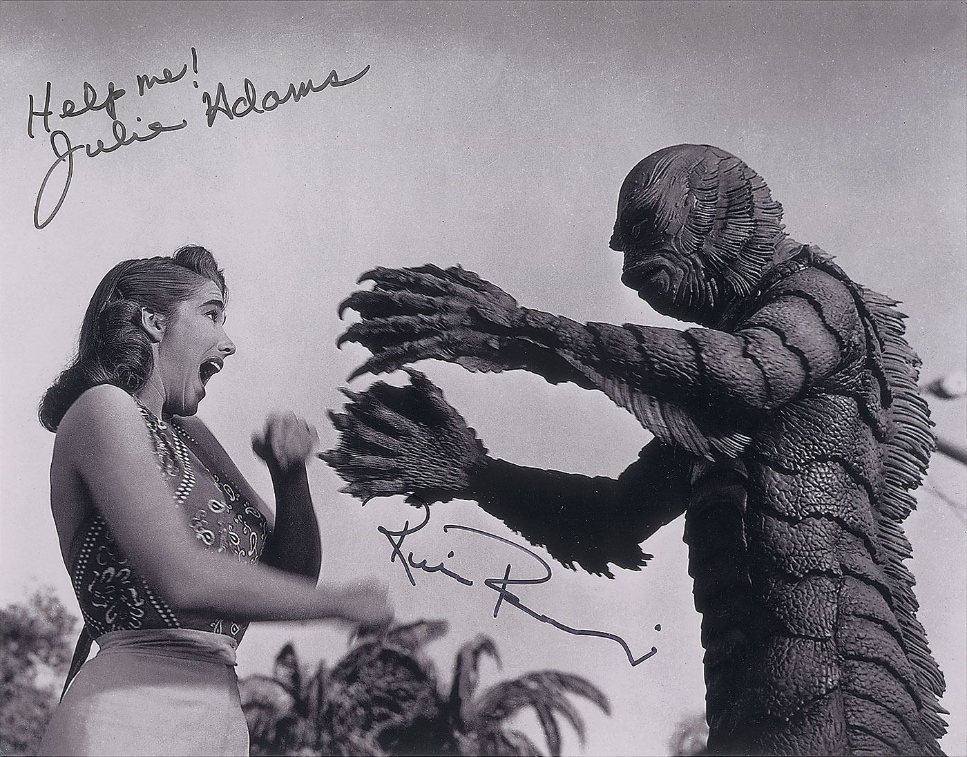 Five items: a group of four black-and-white photos of Ricou Browning wearing his monster costume from the Creature from the Black Lagoon, 8 x 10 and 14 x 11, each signed in blue or black felt tip by Browning, with the largest photo also signed by Julie Adams. Also included is an original felt tip sketch of the Creature from the Black Lagoon on an off-white 6.75 x 3.75 card, signed below in green felt tip by Browning. In overall fine condition.
