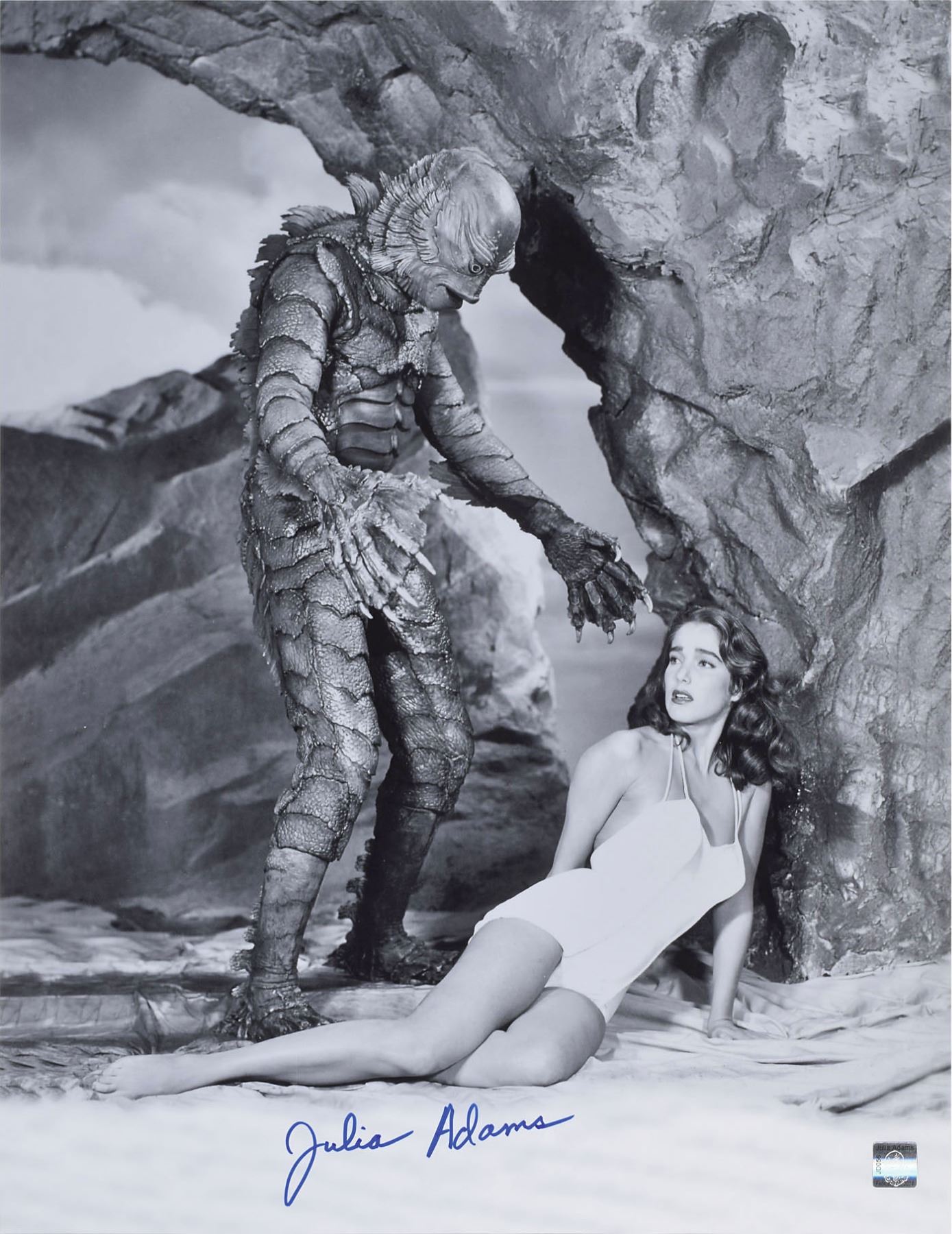 Satin-finish 16 x 20 full-length photo of a scene from the 1954 monster horror film Creature from the Black Lagoon, showing the terrible Gill-man looming over the cornered Kay Lawrence, signed in blue felt tip by Julie Adams. In fine condition, with a Julie Adams label affixed to lower right corner.