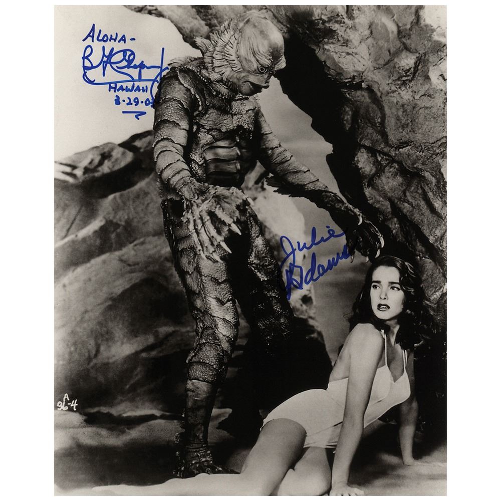 Semi-glossy 8 x 10 photo of Julie Adams and Ben Chapman from the 1954 monster horror film Creature from the Black Lagoon, signed in blue felt tip, "Julie Adams" and "Aloha—B. F. Chapman, Jr., Hawaii, 3-29-03." In very fine condition.