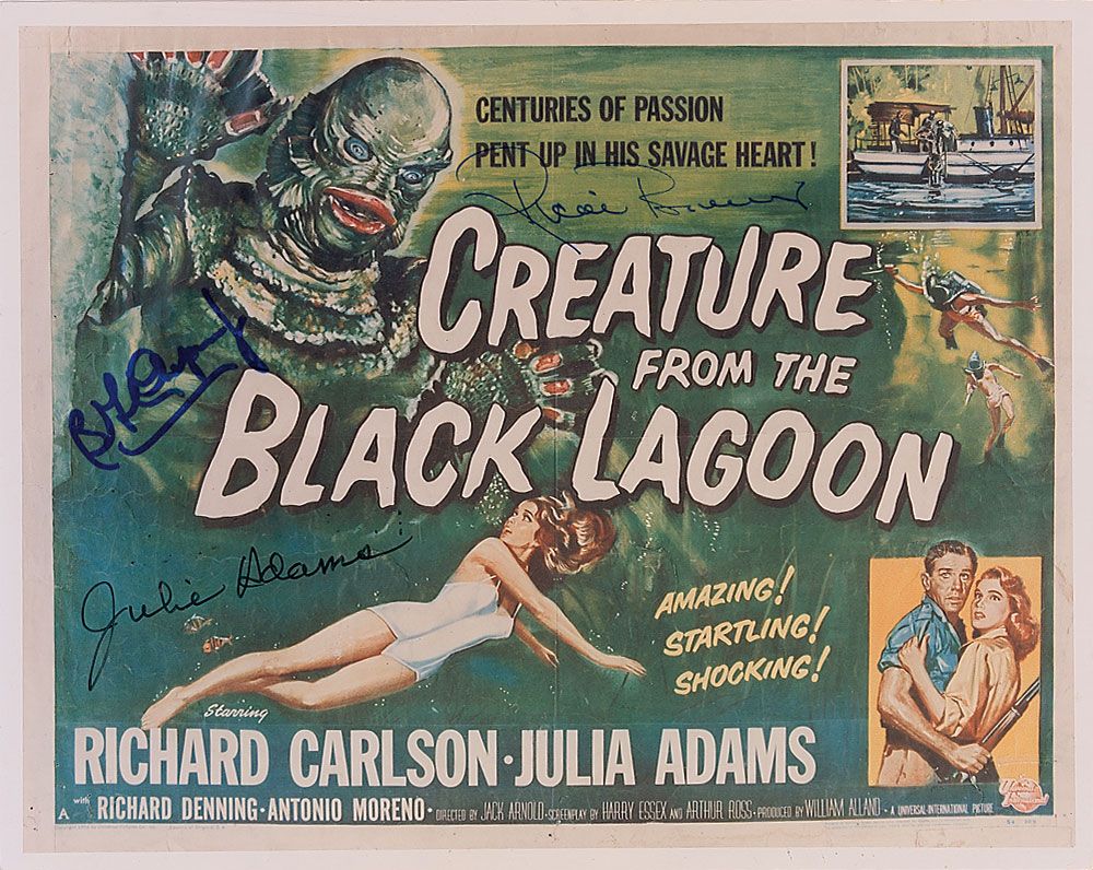Color glossy 10 x 8 photo of a Creature from the Black Lagoon movie poster, signed in blue and black felt tip by Ben Chapman, Jr., Julie Adams, and Ricou Browning. In fine condition.