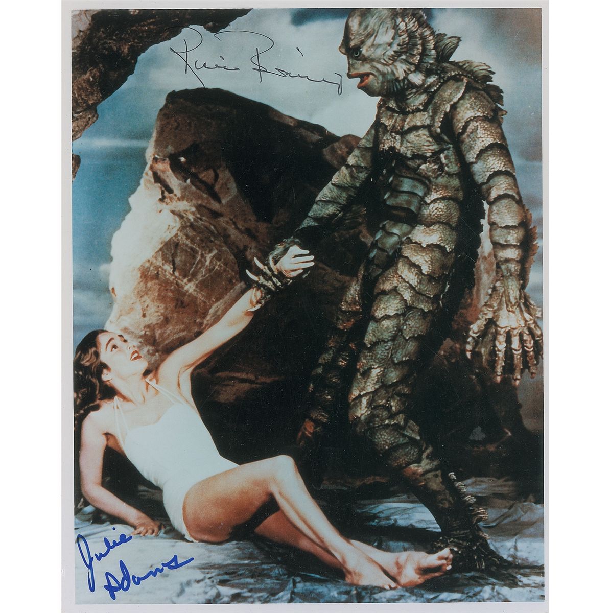 Color glossy 8 x 10 photo from the 1954 Universal horror film Creature from the Black Lagoon, signed in blue felt tip by Julie Adams and in black felt tip by Ricou Browning. In fine condition.