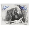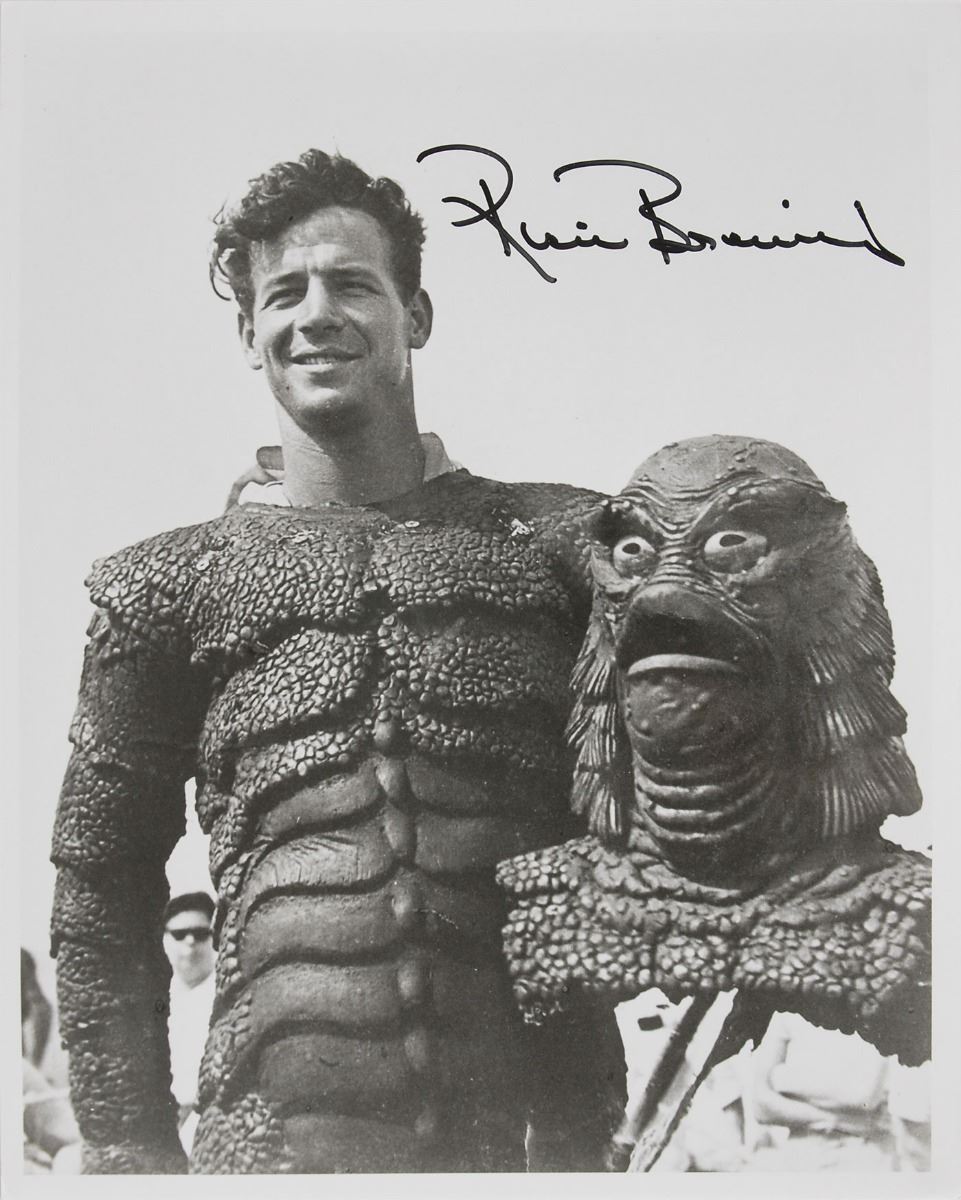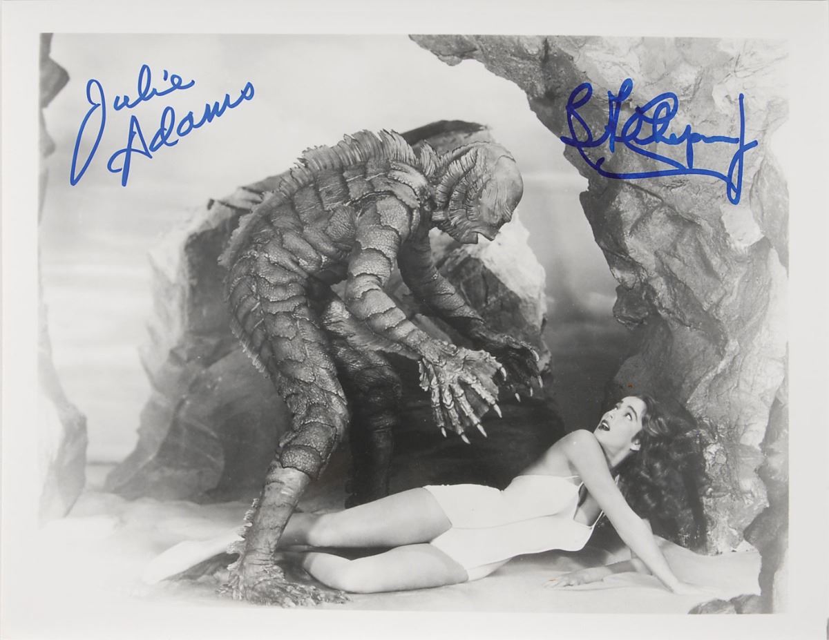 Three glossy publicity still and behind-the-scenes photos of the Creature from the Black Lagoon, 8 x 10 and 10 x 8, two signed in blue or black felt tip by Julie Adams and Ricou Browning, and one signed in black felt tip by Browning. In overall fine condition.