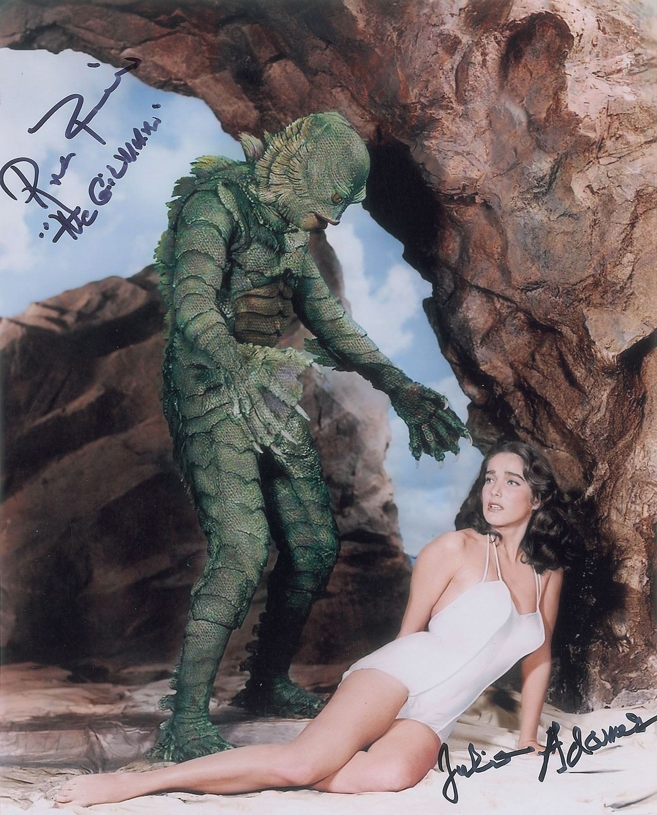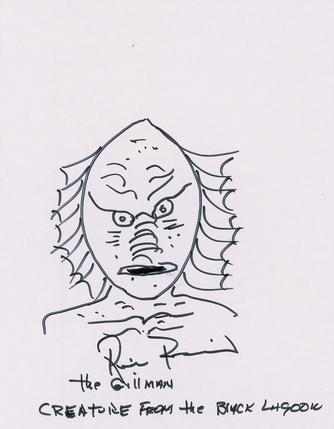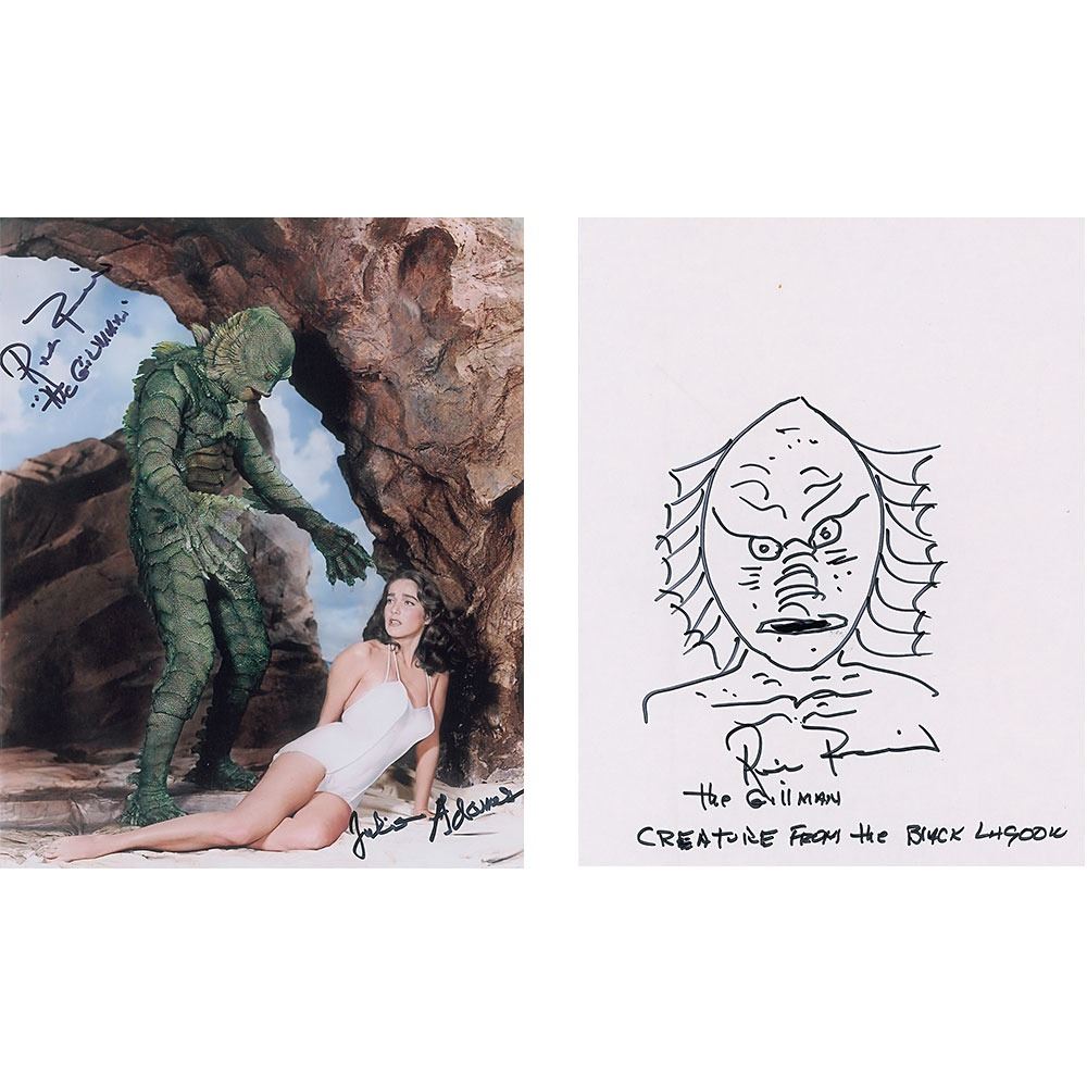 Two items: a felt tip sketch by Ricou Browning of the Creature from the Black Lagoon on a white 8.5 x 11 cardstock sheet, signed below by Browning, who adds: "The Gillman, Creature from the Black Lagoon"; and a color glossy 8 x 10 photo from the 1954 horror classic Creature from the Black Lagoon, signed in black felt tip by Julie Adams and Browning, who adds: "The Gillman." In overall fine condition.
