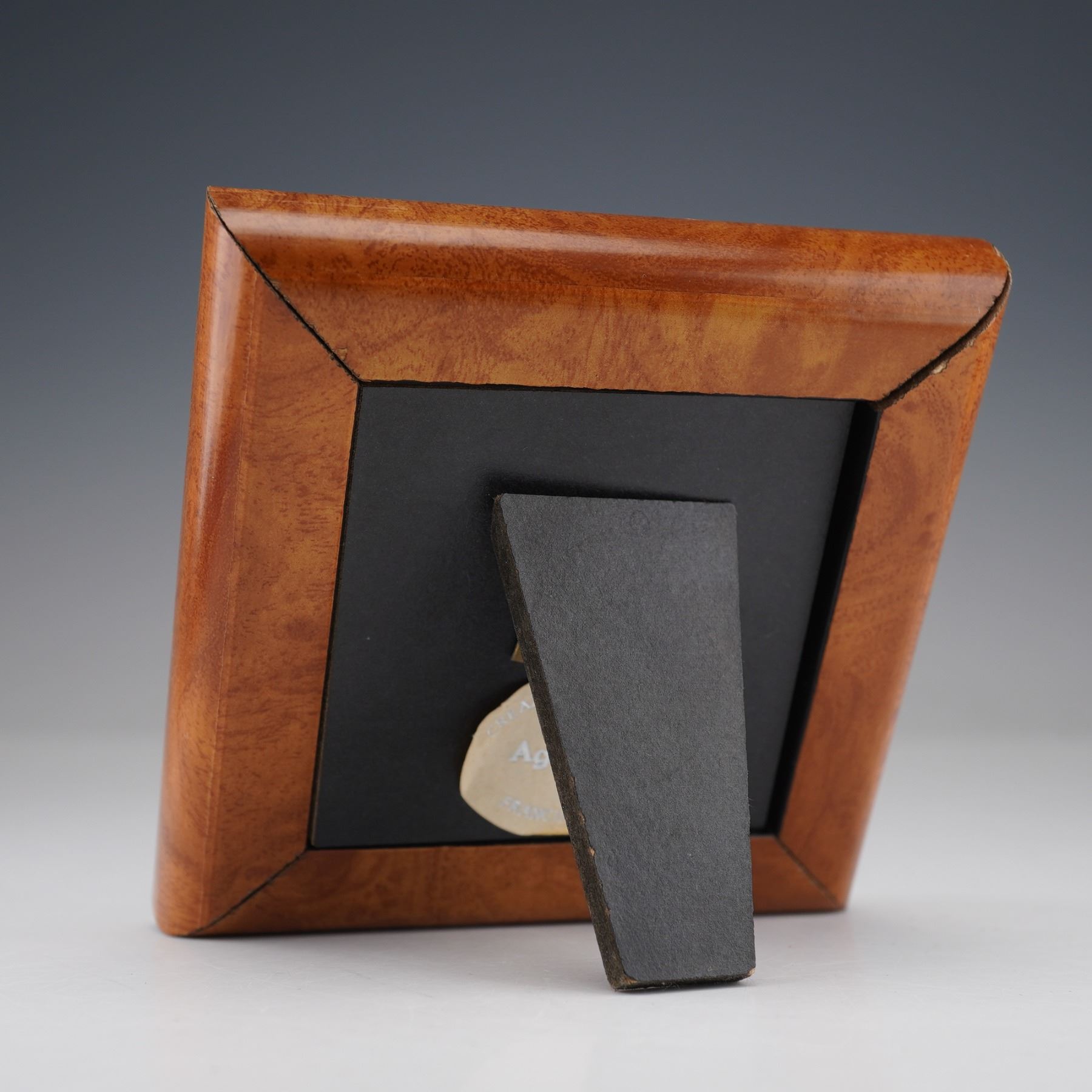 A finely crafted small photo frame featuring a sterling silver front panel with delicately enameled floral motifs in shades of blue, pink, and green, bordered by a gilt accent and set within a polished wooden frame. The circular aperture is designed for a miniature portrait or photograph. Marked on the upper edge with maker's marks and hallmarks including "R" and "42", and labeled on the reverse "Creazioni Artistiche Franciacorta Ag. 925." The overall weight is 60g.