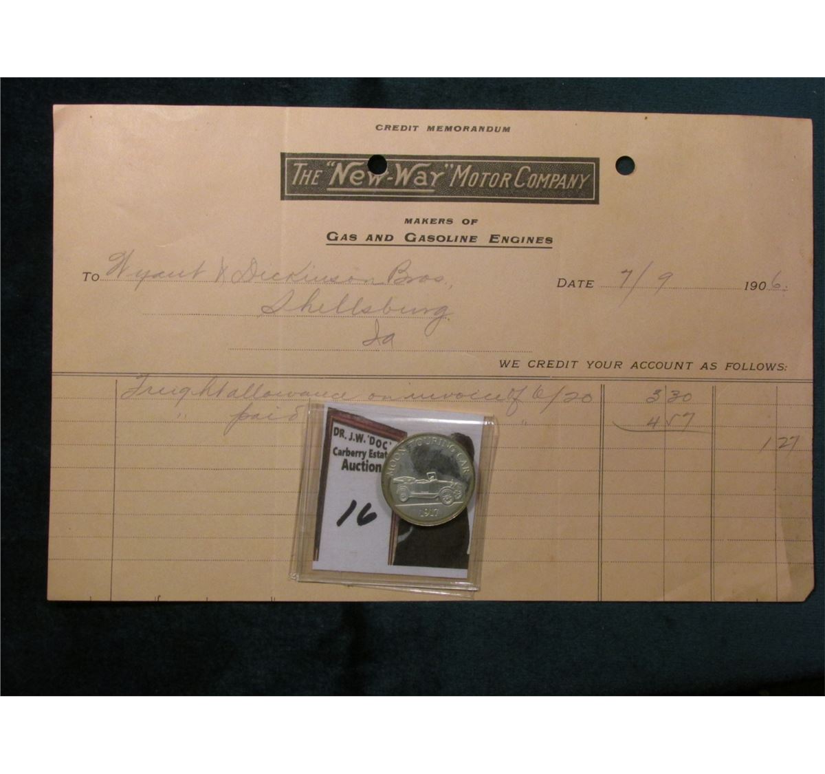 "Credit Memorandum The "New-Way" Motor Company Makers of Gas and Gasoline Engines" Shellsburg, Ia.; & Sterling Silver Medal "1917 Moon Touring Car", Proof, 26mm