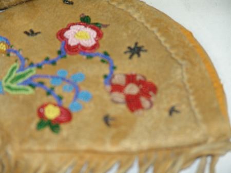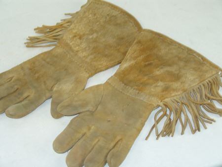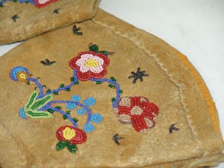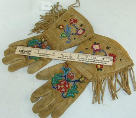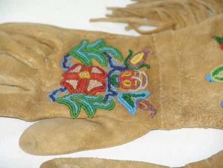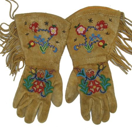 Ca. 1930s, Classic pair of fancy moose hide gloves with floral designs on the backhands and uppers. Shows use, otherwise in very good, usable condition. Women's small