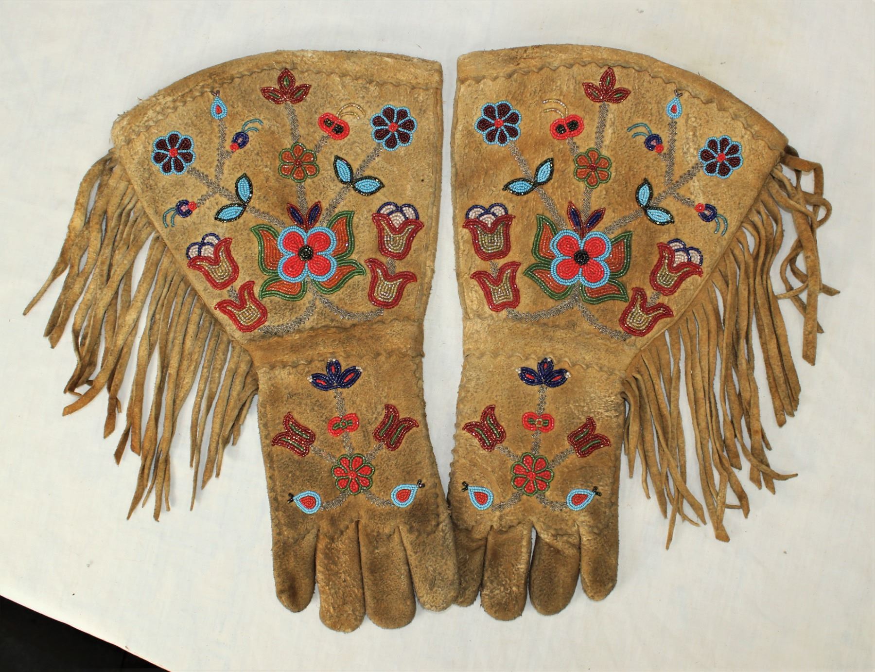 Large leather gauntlets decorated with fringe and flower beaded pattern.