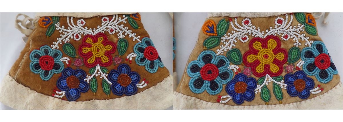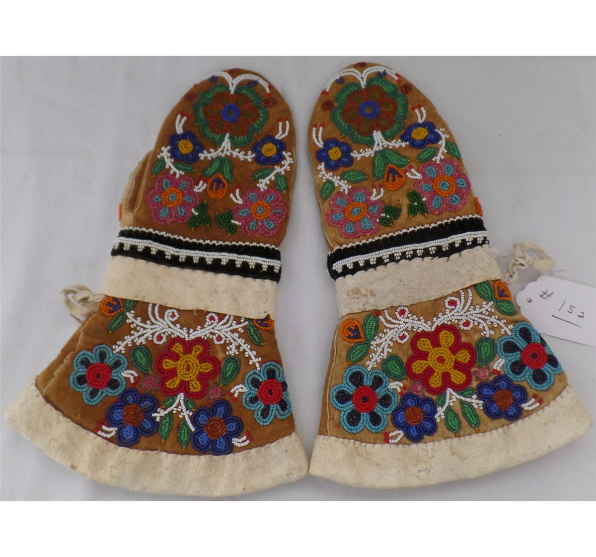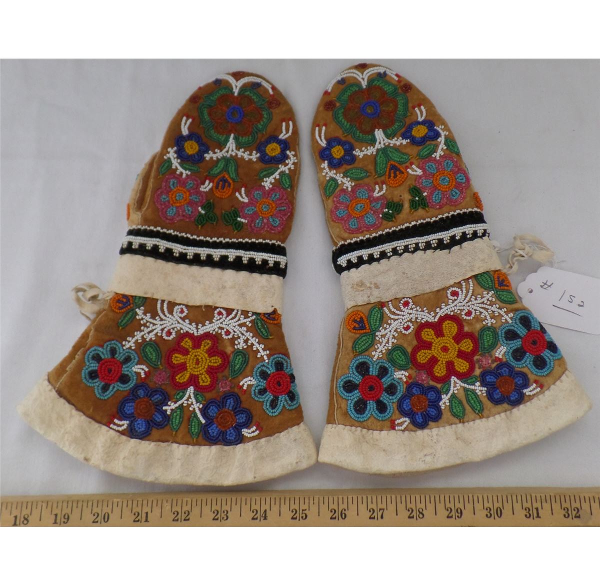 Very fancy pair of gloves which are made from moose hide/deerhide and lined with wool. The gloves are believed to be Cree, from Canada, and measure 12 1/2 x 7 1/2 x 1 ". These very decorative gloves show minor wear, but otherwise fine condition. Shipping $20.00.
