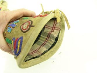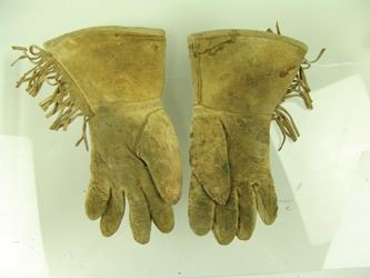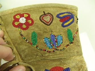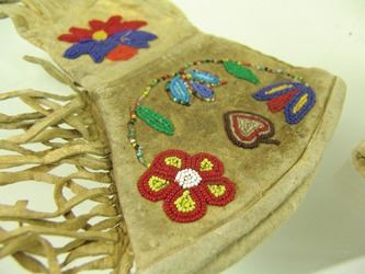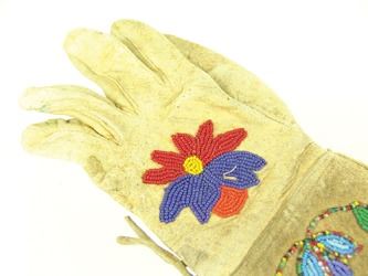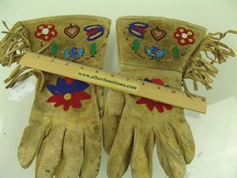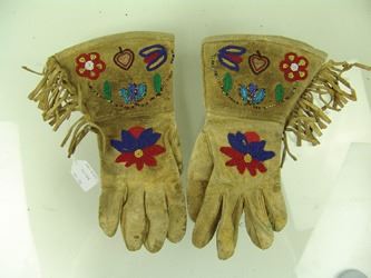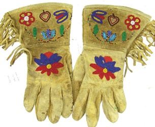 Wonderful pair of early, hand crafted, buckskin and moose hide parade gauntlets/gloves with floral beaded backs and cuffs, and fringed edges. These are decorated with several interesting, and different, distinct floral designs. Good condition, minor repairs. Ex. Bob Wills collection. Ca. 1890s-1920s.