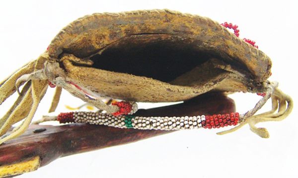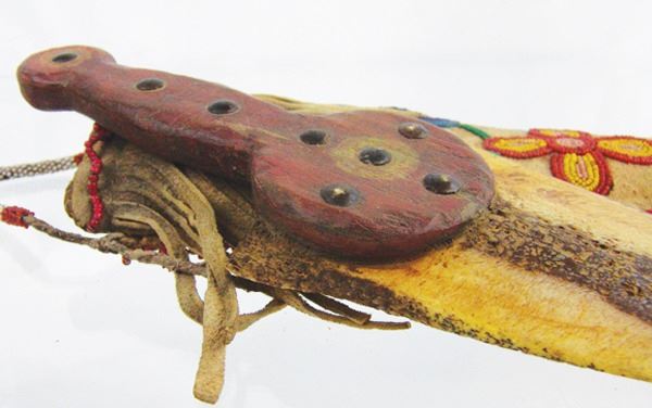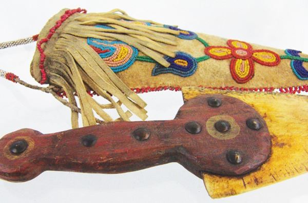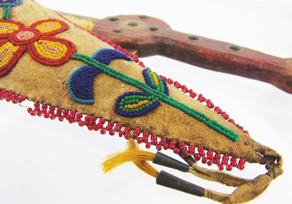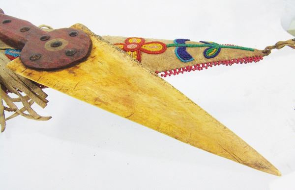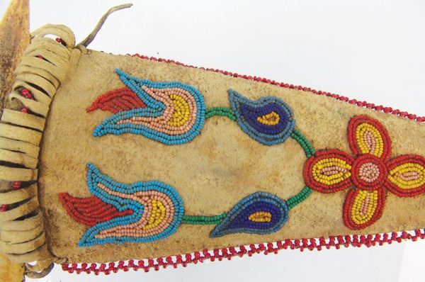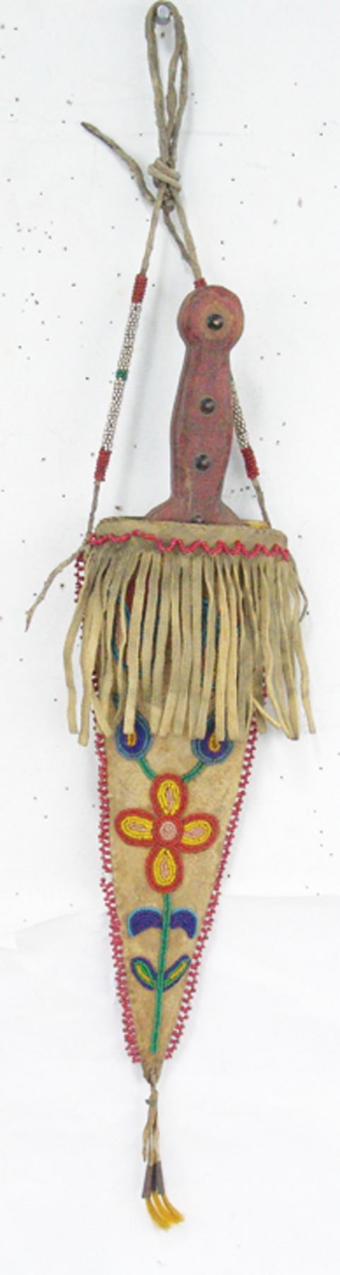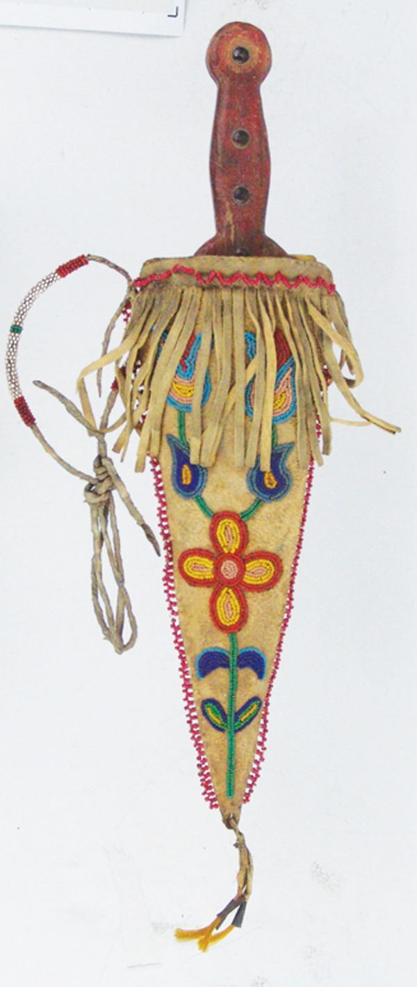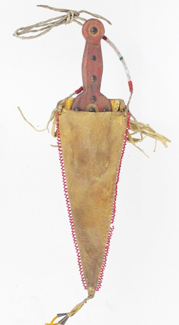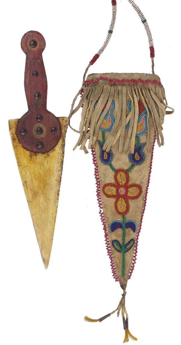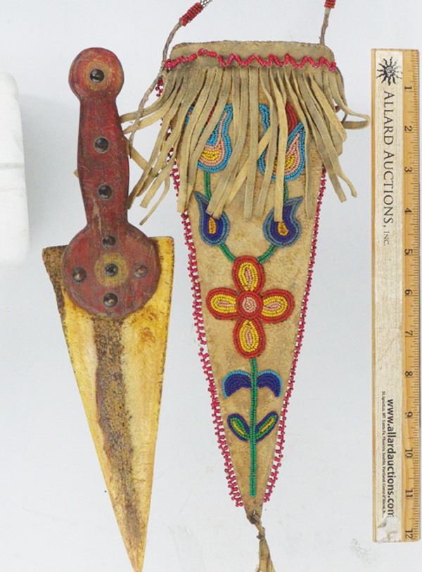 Wonderful hand carved wooden dag with brass tacks and buffalo bone blade, in a beaded elk hide sheath with floral motifs. Very good condition, the white heart trim beads were added later.Various12"