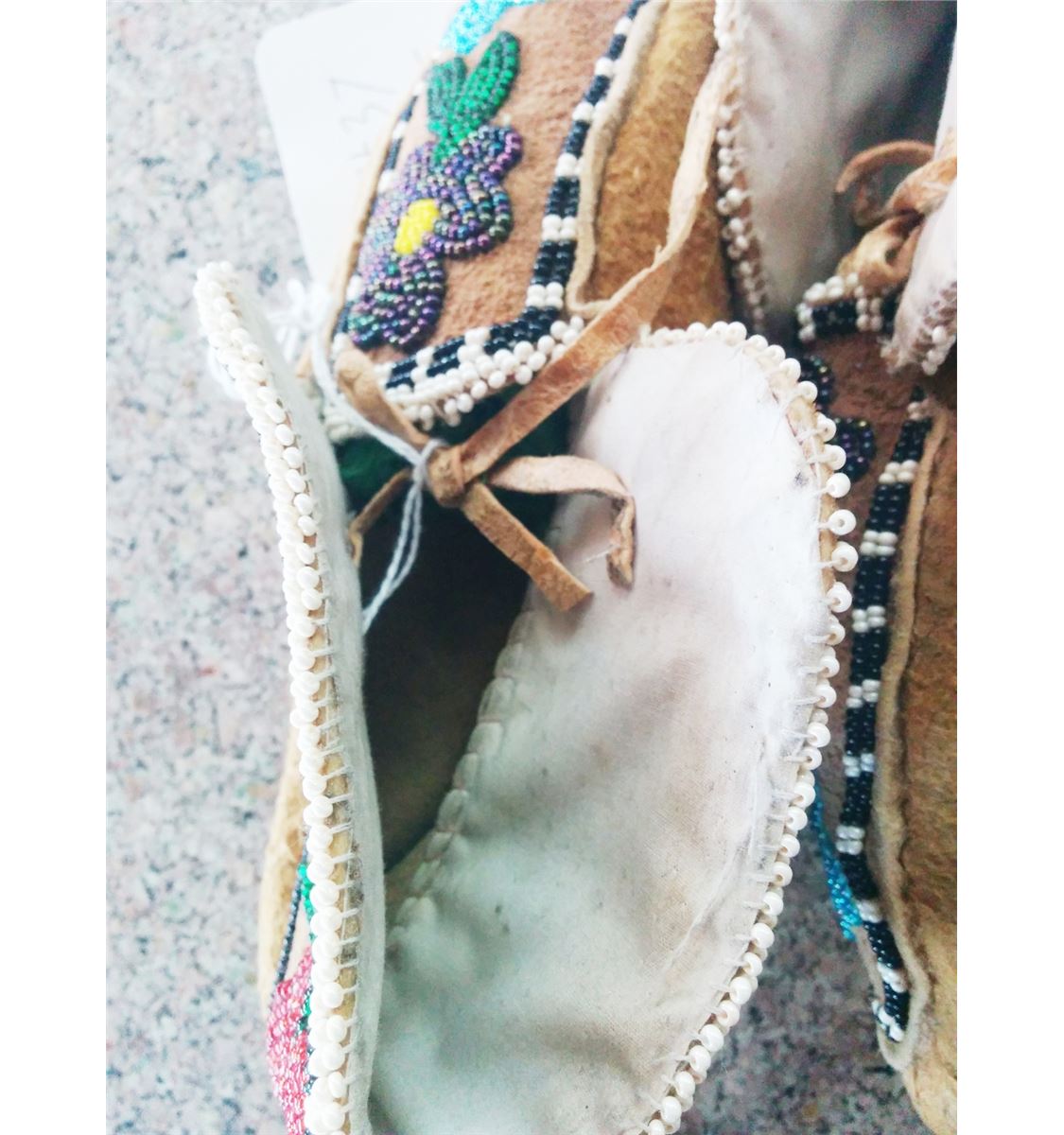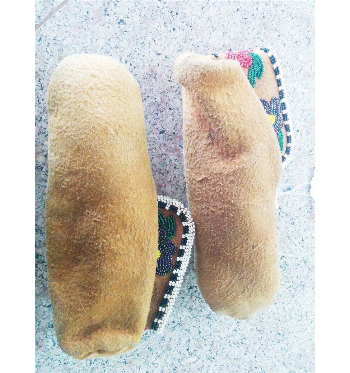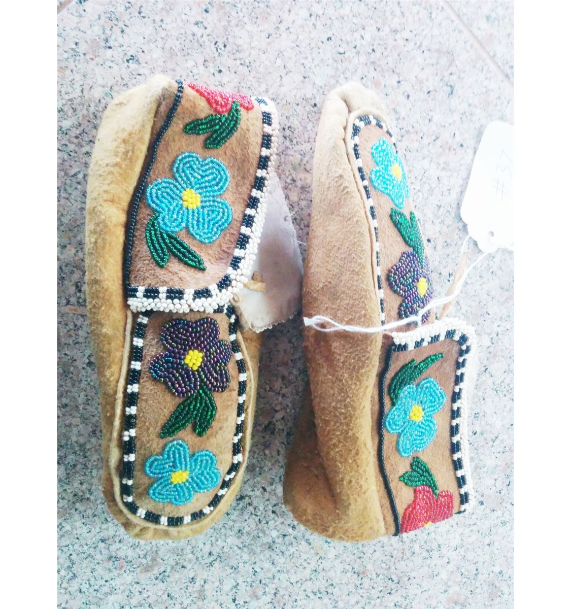 Cree Beaded Moccasins circa 1920. Made of moose hide and cloth. Items measure about 9" x 4" x 3". From Central Canada. Nice moccs with floral pattern, medium size. Condition: Good condition never been worn. Shipping: $17.50.