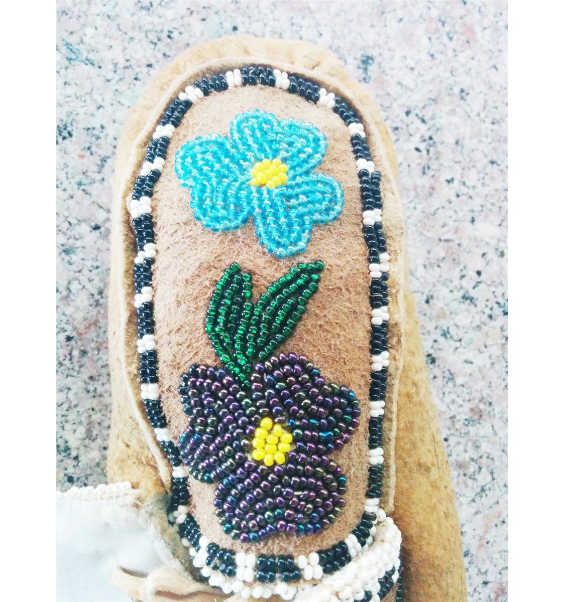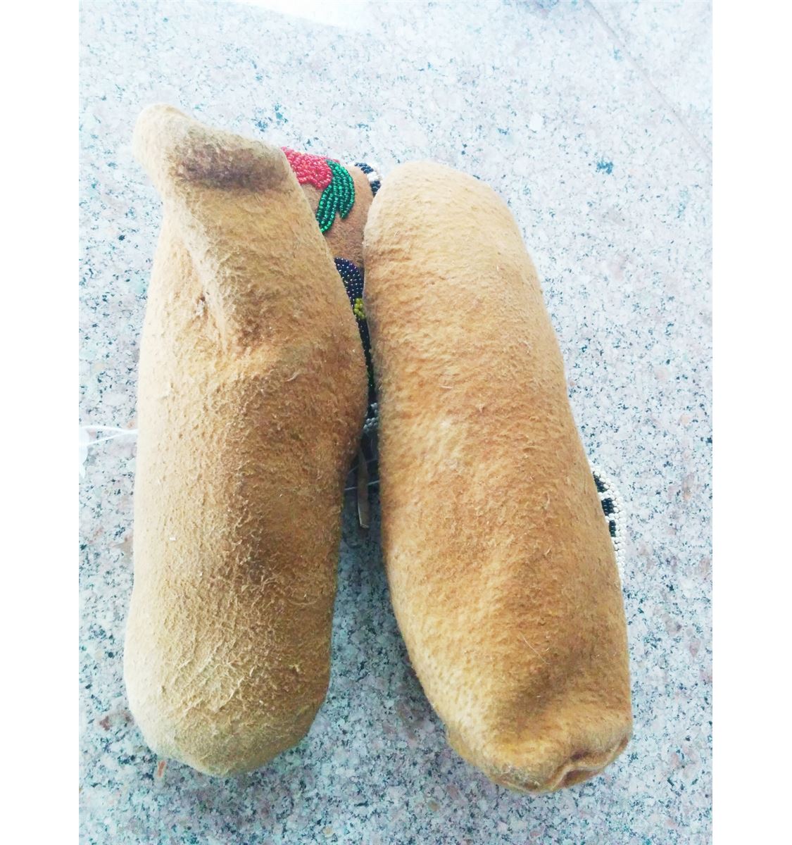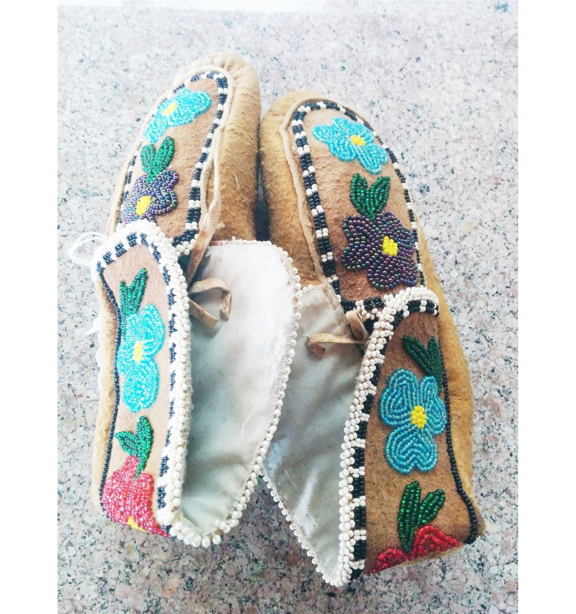 Cree Beaded Moccasins circa 1920. Made of moose hide and cloth. Items measure about 9" x 4" x 3". From Central Canada. Nice moccs with floral pattern, medium size. Condition: Good condition never been worn. Shipping: $17.50.