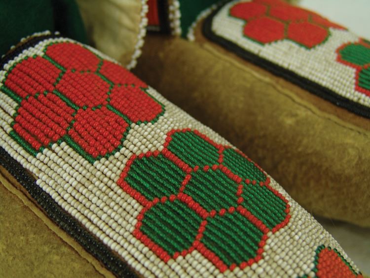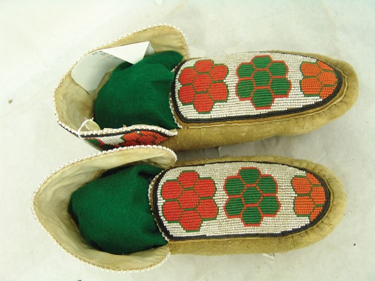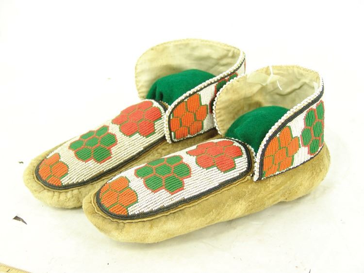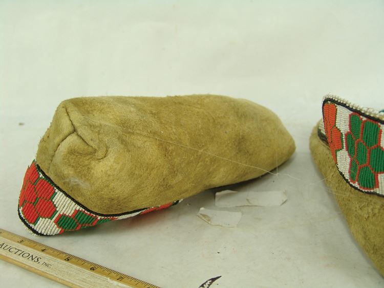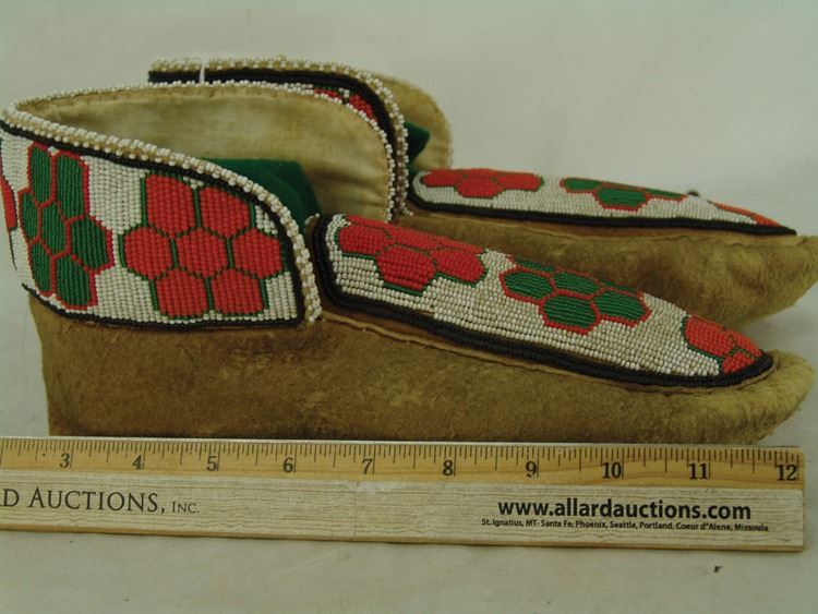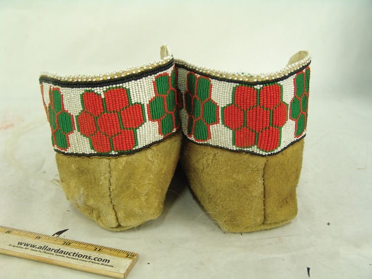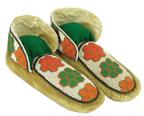 Colorful pair of moose hide moccasins with fully beaded vamp and ankle panels with floral forms. Very good condition.,Mid 1900s,11" (BDWK)