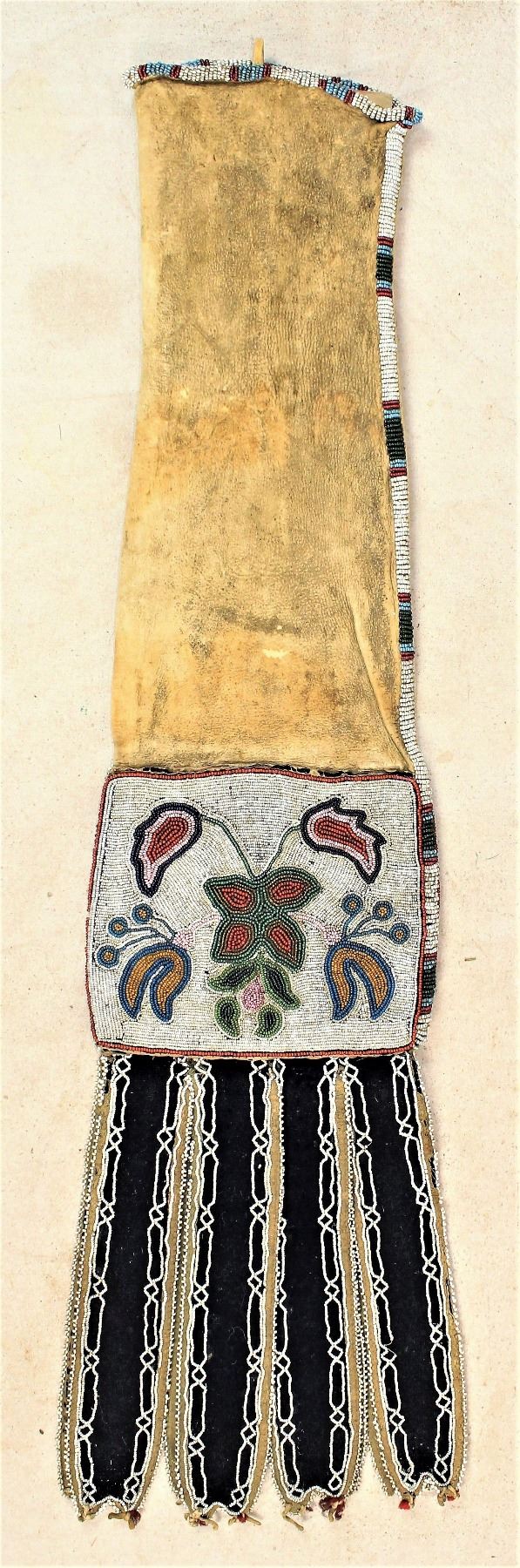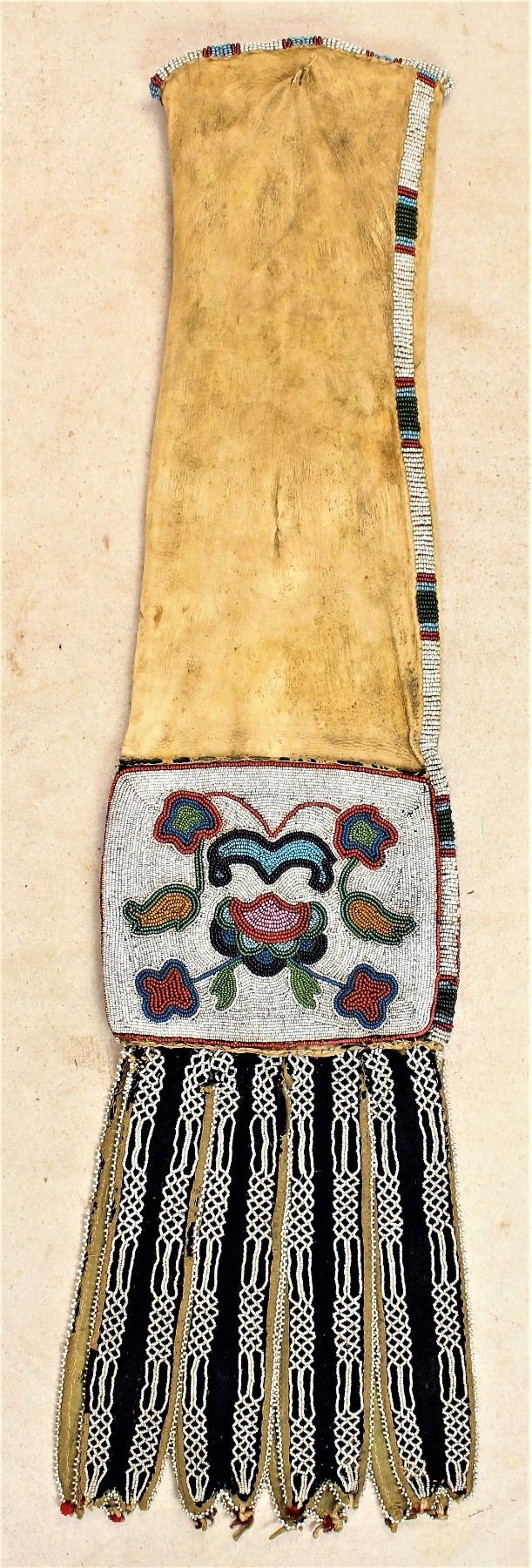 Seldom seen early brain tanned beaded full coverage bag with incredible beaded wide fringe tails, using colorful small seed beads.
