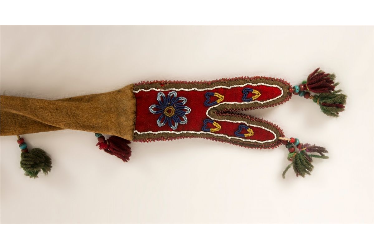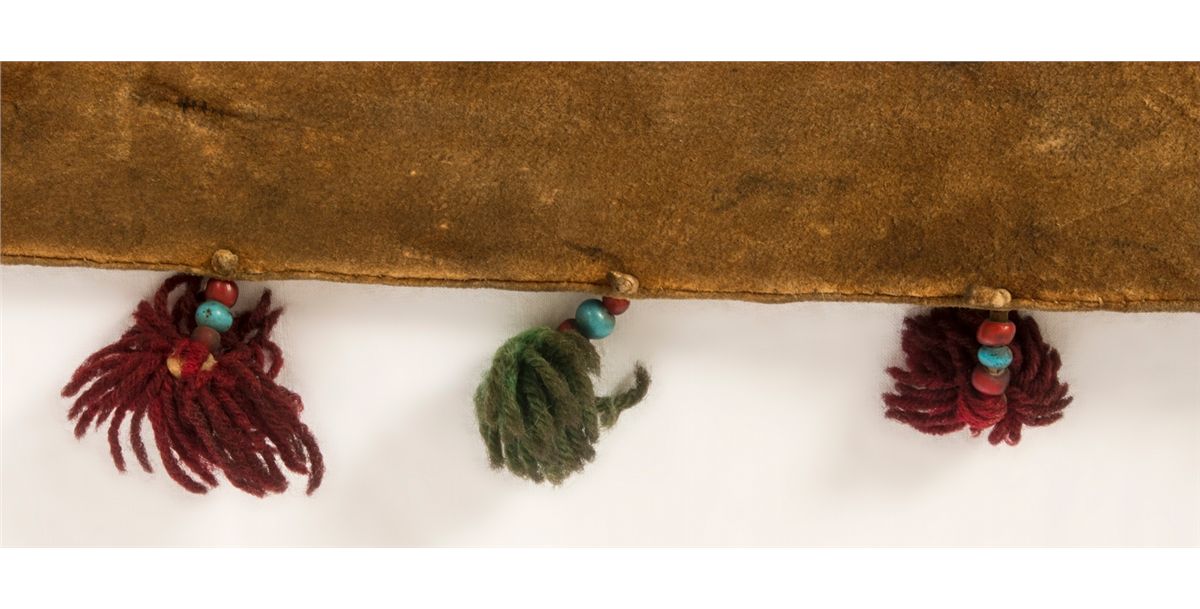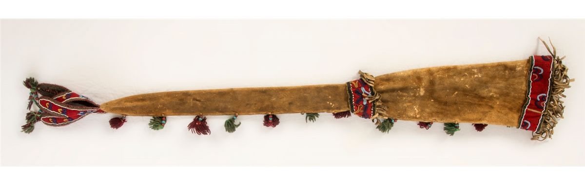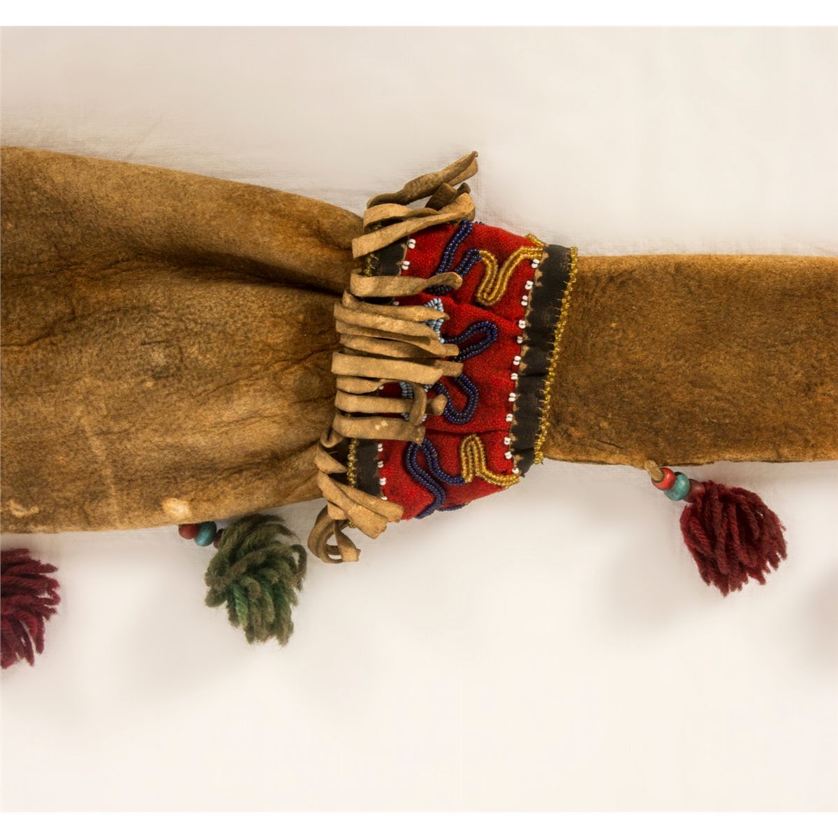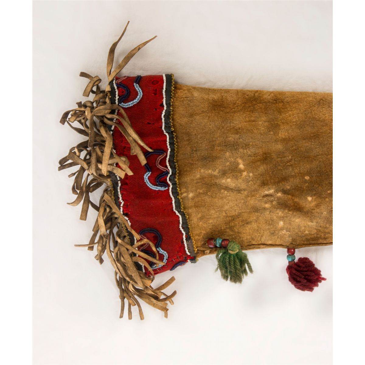 Cree Rifle Case. 38" long with 8" tab on the end. Moose hide case decorated with beaded cloth strips and wool tassels. Circa 1870s. Provenance: Estate of Jim Nicholls.