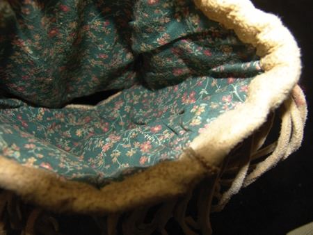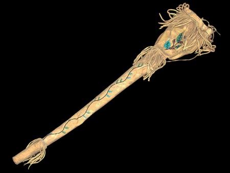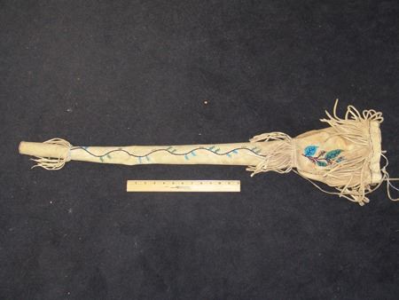 Mid 1900s, Traditionally shaped rawhide tube covered with tanned moosehide and beaded in classic flowing floral design with thick fringe. Very good condition. 38-1/2" long