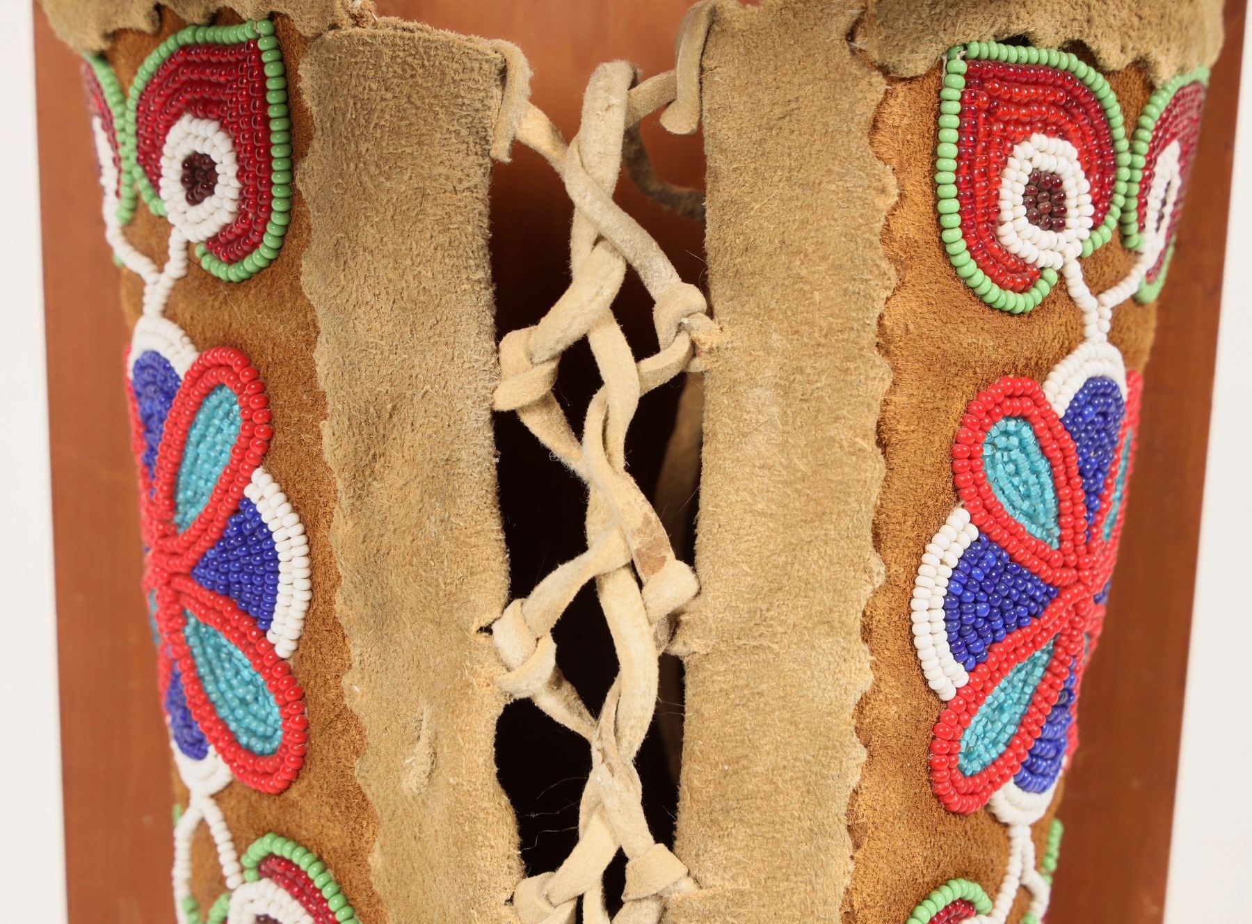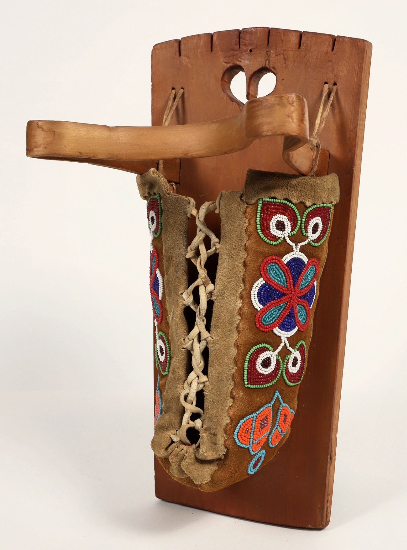 This is a toy cradleboard beaded in the Woodlands style by Cree or Lac Seul Band Indians of Ontario Canada. C.1900. Made of tanned moose hide with a browband. It measures 14.5 in. X 7 in. X 8 in. In very good condition, all beads intact with a buffalo plaid trade cloth liner. Please see photos for details.