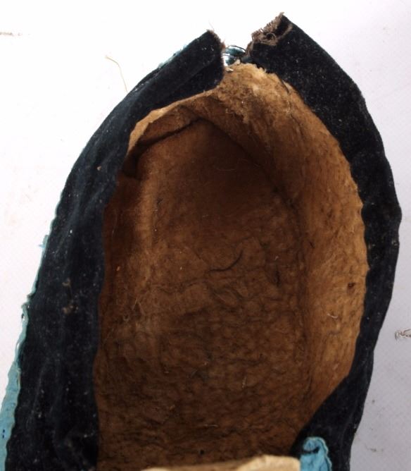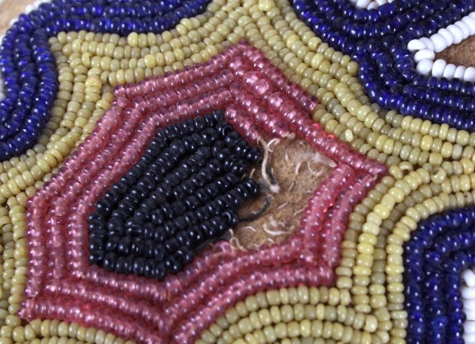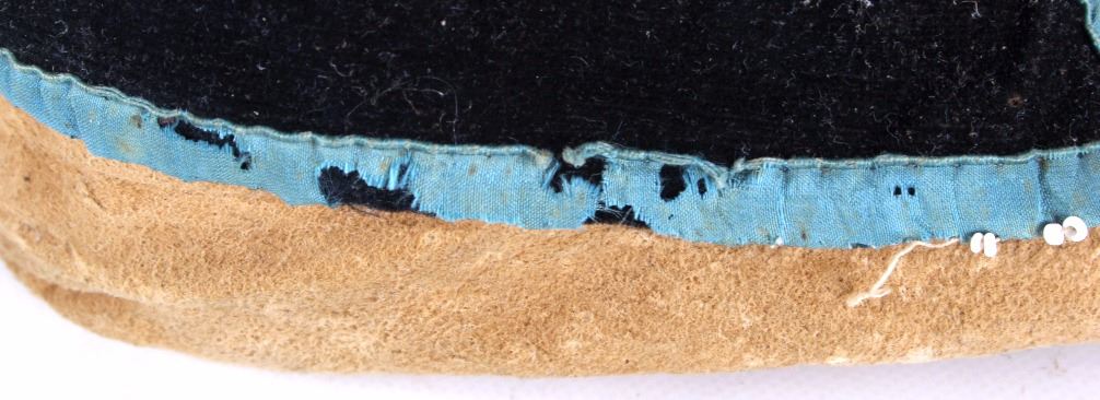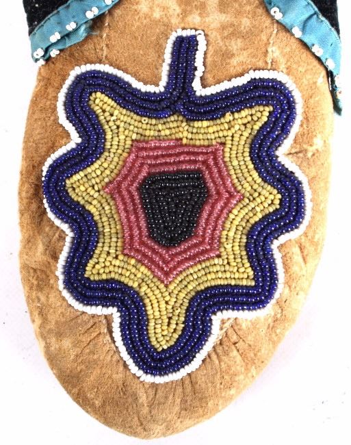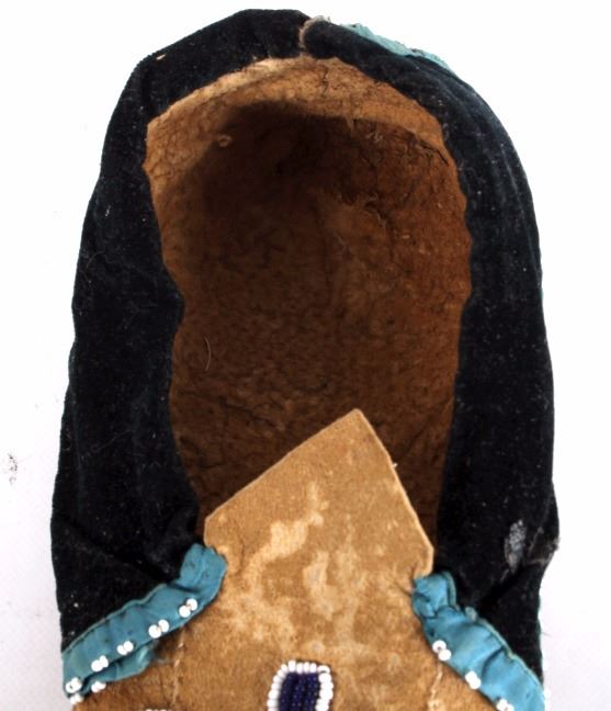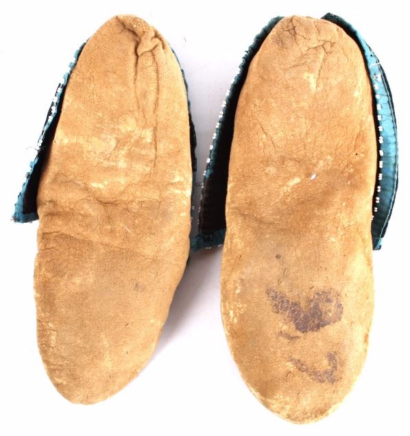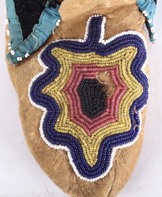 This lot features a Cree beaded Moccasins from the Early 1900's. These pieces are wonderfully beaded showing Black, greasy yellow, blue, and white. There is trade cloth around the ankle and that is edged with a blue cloth and sewn white beads. These pieces are in good condition for their age, but are missing some beading and show wear. They measure 9 3/4" L x 4" W x 2 1/2" H