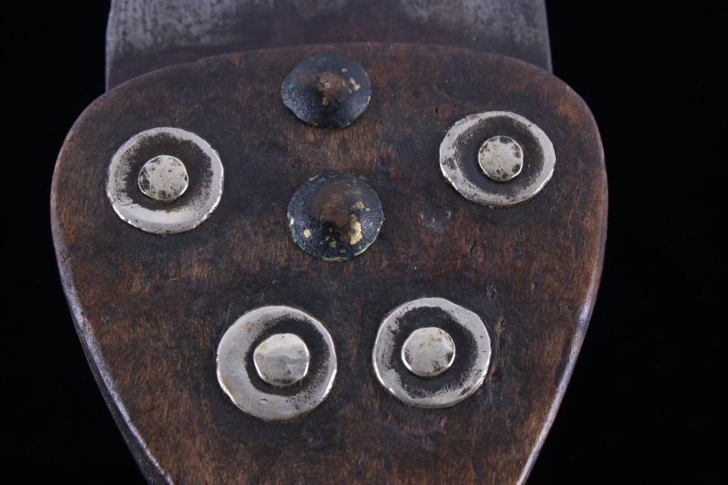 This is a wonderful original American Indian Dag knife attributed to the Cree Native American Indians and dating to circa Mid-19th Century. This “Chief’s Grade” or “Presentation Grade” knife features a solid wood nicely figured grain handle / grip that is secured with seven silver pins and rivets. This style of ornate dag knife is referred to as a “Chief’s Grade” or “Presentation Grade” knife as they were given to Chief’s and tribal dignitaries during trade negotiations and treaty signings. The forged iron knife shows a raised median ridge running down the center of the blade, a documented early weapon features also seen on dag knives dating to pre-1860. Th dag fighting knife is adorned with brass trade tacks at the pommel or end along with two at the bolster on one side and one with a silver pewter crown emblem on the other. The crown emblem indicates that the dag knife was likely of British manufacture for the fur trade. American Indian early dag knives are commonly referred to as “Beaver Paddle/ Beavertail” dag knives. This is due to the fact most dag knives were traded on the frontier along the Great Lakes region through the St. Lawrence seaway westward by early fur traders. From the Great Lakes region on westward the knives became very popular among the Northern Plains/Upper Plateau tribes such as the Cree, Metis, Blackfoot, Nez Perce, Chippewa/Ojibiwa and Shoshone. These were made to be killing weapons, this is why dag knives show a clean long double-sided blade without any serration as they were for battle. Unlike other knives worn by Indian Warriors the dag knife would have been worn around the Indians neck on his chest. The knife shows a rich original patina and signs of age and use with minor nicks and expected wear, otherwise the piece displays very well. Provenance: From the Ben Thompson Collection, a noted war club and tomahawk collector and author / expert. The piece comes from the same collector as the Dag Knife sold by our company on 4/29/2017 for $10,200 (with premiums) that was authenticated by the Sotheby’s expert David Roche and from the same collection as the Cree Dag Knife with Sheath that sold for $12,300 (with premiums) at our companies 8/25/2018 sale. The piece shows the proper signs of age and use with minor dings and scratches and a fine patina. Measures overall 13”L.