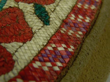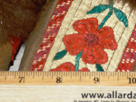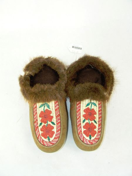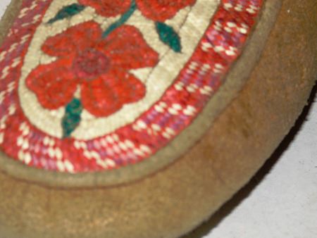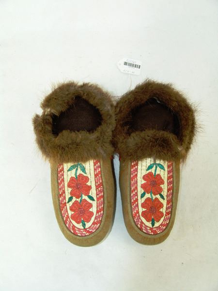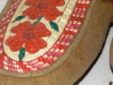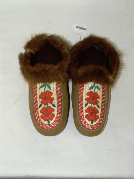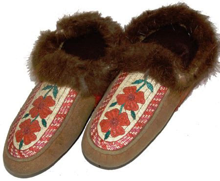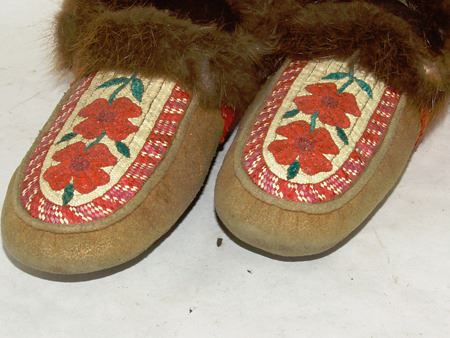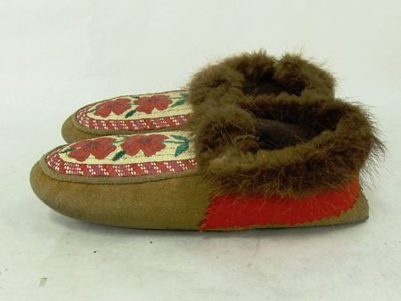 Mid 1900s, Traditional pair of moosehide and beaver fur moccasins, the vamps decorated with fine plaited quillwork featuring red roses. Very good condition. 11"