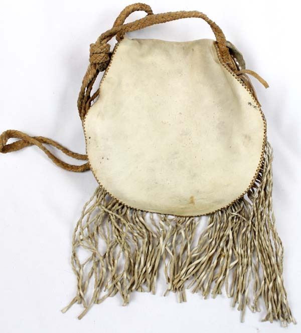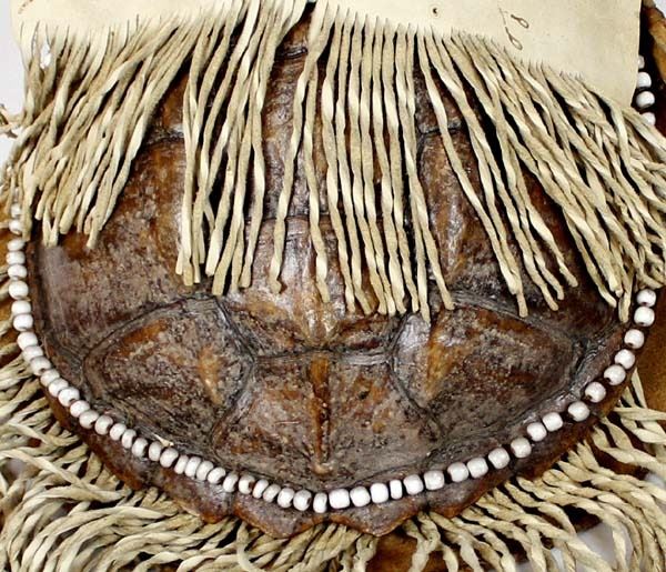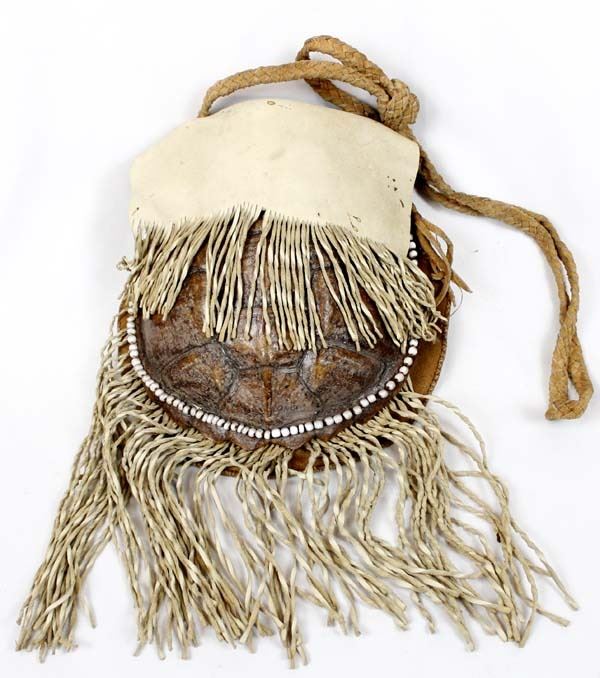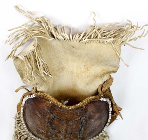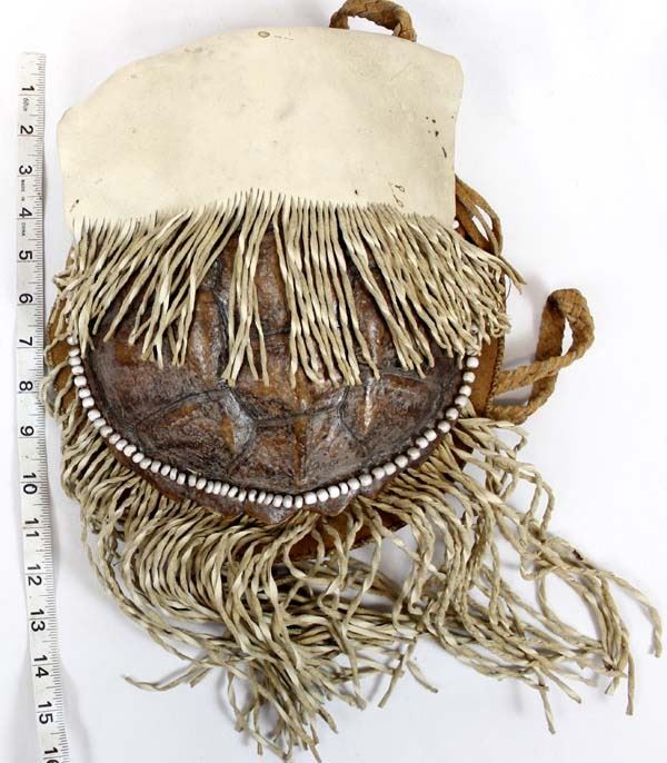 Vintage Native American Cree Turtle Shell Leather Medicine Bag by Sonny DeCoster, measures 17'' x 11'' which includes the fringe, made from a Snapping Alligator Turtle Shell as the front of the bag, leather back and fold-over flap closure, embellished around the turtle shell with old beads, braided leather strap