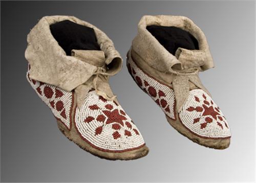 Cree Beaded Moccasins. 11 1/2" long. High cuffs. Red pony beads in star designs on a white background. c. 19th century. (est $2,500-3,500)