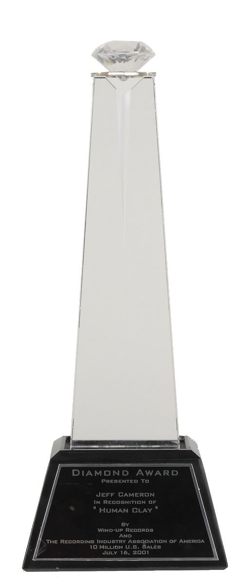 Official RIAA Diamond Award commemorating the success of Creed’s 1999 album Human Clay, measuring 16? tall and weighing 10.35 pounds, consisting of a large crystal diamond displayed atop a glass obelisk set upon a black base, with an engraved plaque reading: “Diamond Award, Presented to Jeff Cameron in recognition of ‘Human Clay,’ by Wind-Up Records and the Recording Industry Association of America, 10 Million U.S. Sales, July 16, 2001.” In very good to fine condition, with the diamond and metal support re-glued at the top. Designed by Peter Wayne Yenawine, a master designer at Steuben Glass, these distinctive diamond award sculptures are made of fine lead crystal and of the utmost desirability.